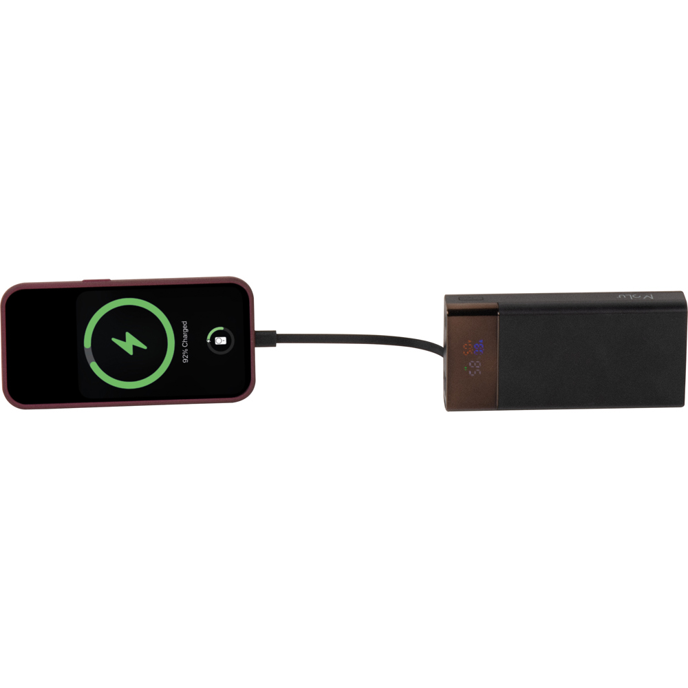 De ultieme mobiele voeding met onze powerbank, die een indrukwekkende capaciteit van 20.000 mAh biedt. Deze krachtige powerbank is voorzien van een snellaadfunctie waardoor jouw apparaten binnen een mum van tijd weer klaar zijn voor gebruik. Met twee USB-poorten, een USB-C-poort en een geïntegreerde iOS-kabel biedt hij diverse oplaadmogelijkheden voor al uw apparaten. Op het slimme LCD-laadscherm zie je in één oogopslag de huidige laadstatus en andere belangrijke informatie. Uw persoonlijke logo of reclameboodschap wordt prominent op de powerbank gedrukt en zorgt voor een opvallende en professionele presentatie van uw merk. Deze powerbank is het ideale relatiegeschenk of praktische accessoire voor het dagelijks leven, dat overtuigt door functionaliteit en hoogwaardige afwerking.