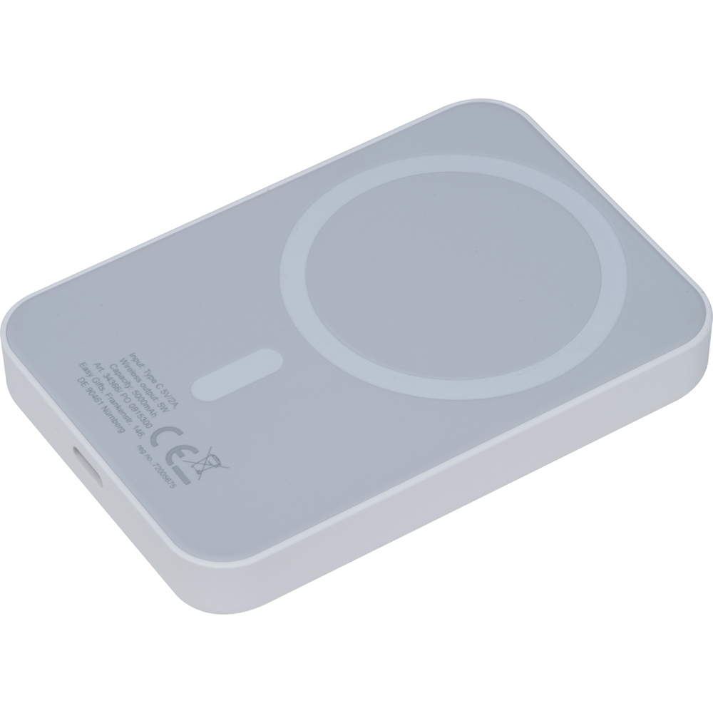 MagSafe powerbank van kunststof met 5.000 mAh capaciteit en rubberen oppervlak voor een bijzonder aangenaam gevoel. Met USB-C-poort voor opladen (invoer en uitvoer aangesloten 10W, uitvoer draadloos 5W). Compatibele apparaten vanaf iPhone 12, Android-apparaten met Magsafe-oplaadfunctie. Wij graveren uw reclame op de voorkant van de powerbank in het onderste derde deel.