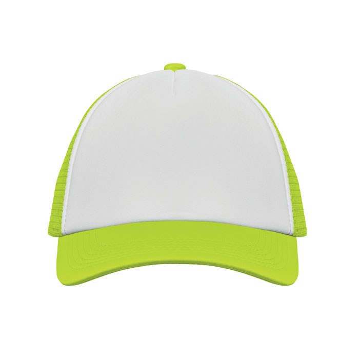 Truckers baseballpet van polyester 140-150 gr/m²met verstelbare sluiting. Witte voorzijde en gekleurde klep van polyester jersey met schuimrug. 5 Panelen. Andere panelen in gekleurde mesh. Size 7 1/4