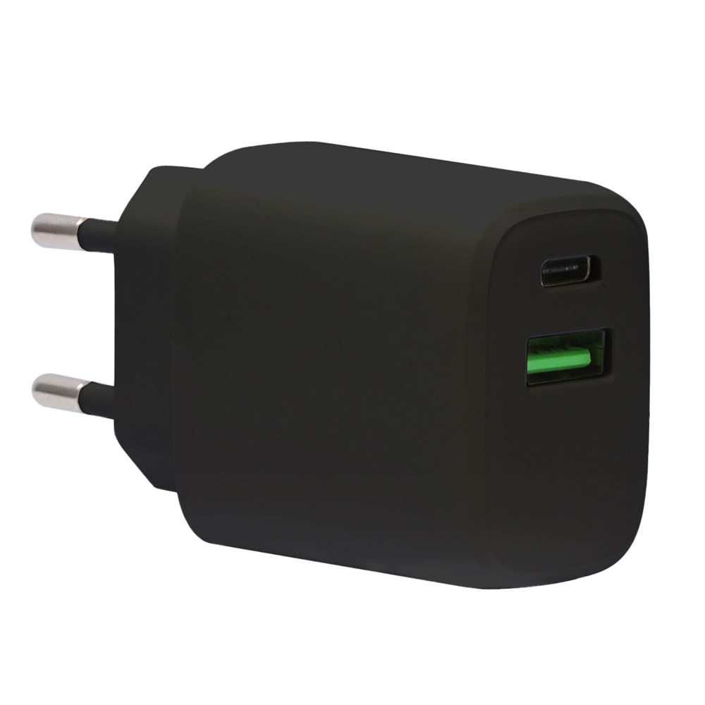 Adapter met Power Delivery Fastcharge TÜV GS gecertificeerde kwaliteit USB C en USB A 3.0 Ingang 100-240 V 50/60 Hz 0,5 A PD Uitgang: 5 V 3 A = 15 Watt 9 V, 2,22 A = 20 Watt 12 V, 1,67 A = 20 Watt USB Uitgang 5 V 3 A = 15 Watt 9 V, 2 A = 20 Watt 12 V, 1,5 A = 20 Watt Totale uitgang 5V = 3A Individueel verpakt in witte displaydoos