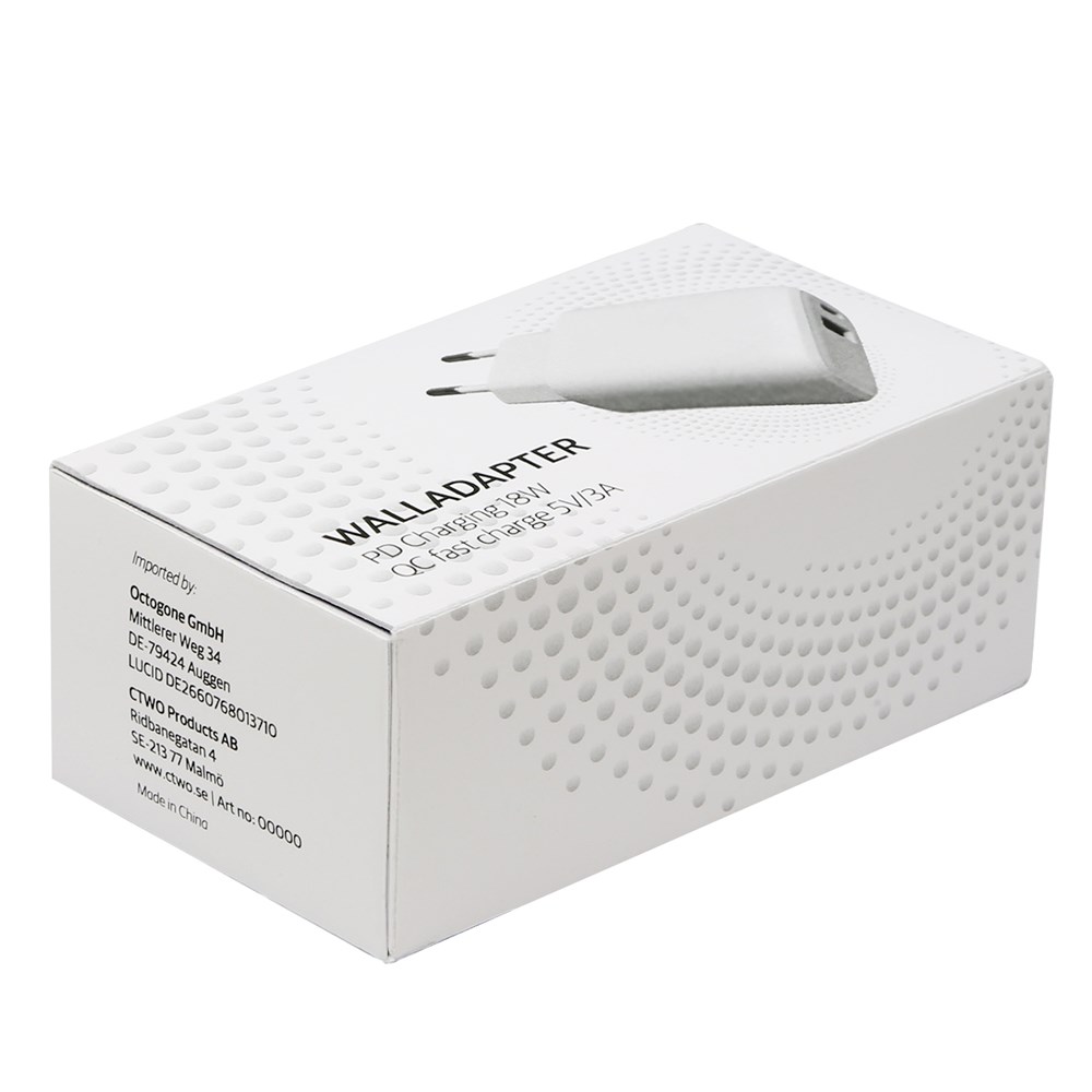 Adapter met Power Delivery Fastcharge TÜV GS gecertificeerde kwaliteit USB C en USB A 3.0 Ingang 100-240 V 50/60 Hz 0,5 A PD Uitgang: 5 V 3 A = 15 Watt 9 V, 2,22 A = 20 Watt 12 V, 1,67 A = 20 Watt USB Uitgang 5 V 3 A = 15 Watt 9 V, 2 A = 20 Watt 12 V, 1,5 A = 20 Watt Totale uitgang 5V = 3A Individueel verpakt in witte displaydoos