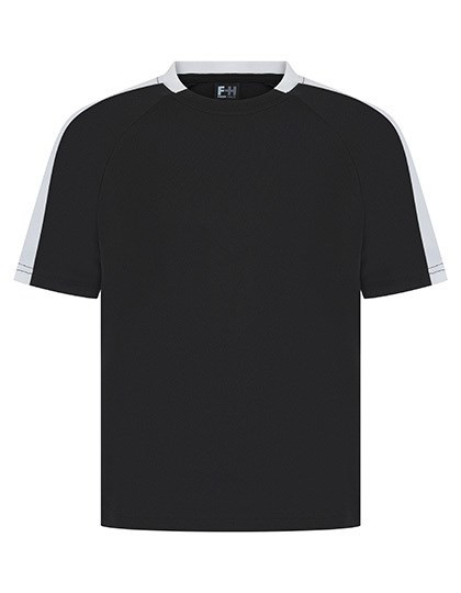Single jersey | Afvoerende afwerking op stof | 2-delige contrasterende kraag | Ronde halsuitsnijding | Raglan mouw | Contrasterende zijpanelen uit dezelfde stof op de mouw | Afscheurbaar label