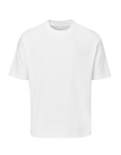 100% (biologisch of in omschakeling) katoen | Single jersey | Oversized uniseks pasvorm | Zacht, zwaar | Hangende schouders | Diepe zoom met dubbele naad op lichaam en mouwen | Dikke 1x1 rib kraag | Afscheurbaar neklabel | Zorglabel met QR-code om de toeleveringsketen te volgen en de positieve impact van biologisch kopen te controleren
