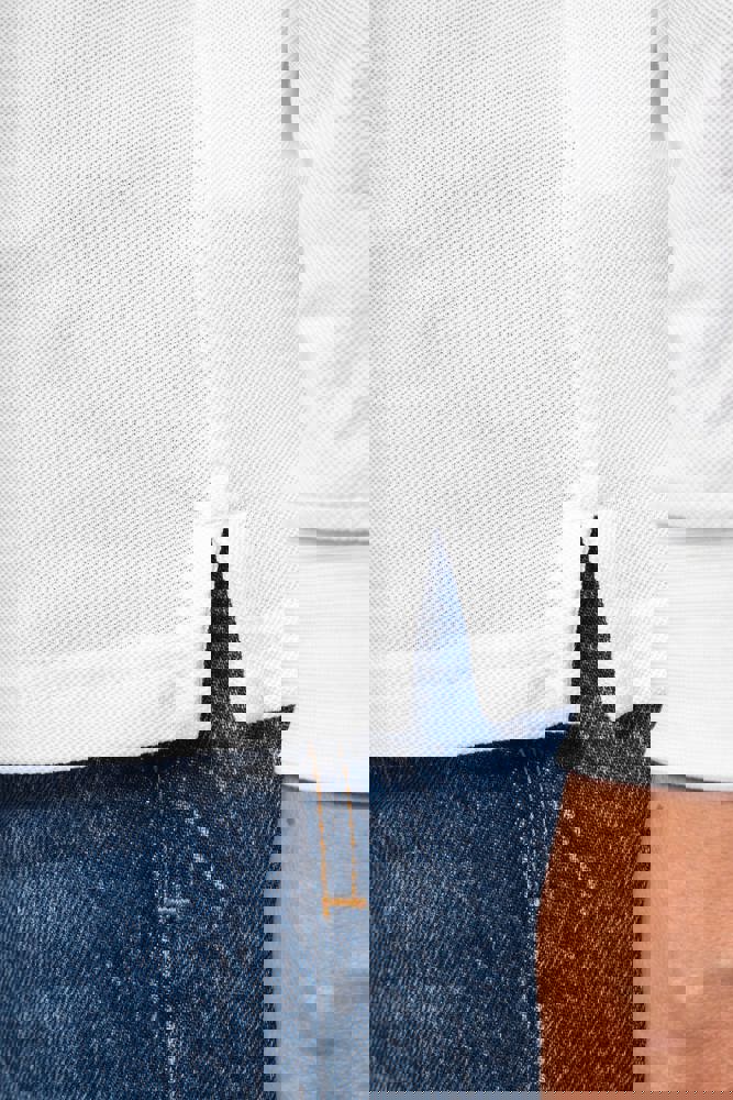 100% biologisch katoen. Gekamd katoen. Piquétricot. Rechte snit. Enzymgewassen. Lange mouwen. Zijnaden. 1x1 ribboord aan hals en mouwuiteinden. Knooplijst met twee bijpassende knopen. Bijpassende nektape in de hoofdstof in de kraag. Verstevigde schouders. Zijsplitten. Boord onderaan afgewerkt met dubbel stiksel. Geen merklabel, enkel een afscheurbaar maatlabel voor eenvoudige personalisatie.