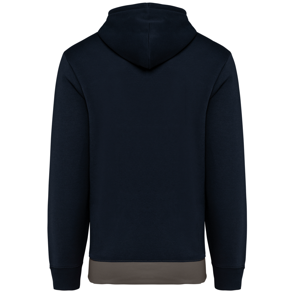 80 % katoen/20 % polyester. Buitenoppervlak 100% gekamd katoen. Rechte snit. Aan de binnenkant geborsteld fleece 3 draden. LSF (Low Shrinkage Fleece). Enzymgewassen. Driekleurige sweater met capuchon met centrale witte streep op alle kleuren. Afwerking ribboord 1x1 aan mouwuiteinde en aan de onderkant in kokervorm voor een betere afwerking, met stiksel. Kangoeroezak met dubbel stiksel. Capuchon met plooien, oogje en metalen koorduiteinden, met ronde aanrijgkoordjes Toon-op-toon nektape met visgraatmotief. In de mouwuiteinden en onderaan zit elastaan om vervorming van het kledingstuk te voorkomen. Halvemaanvormige afwerking op de achterkant voor eenvoudige personalisatie. Afscheurbaar merklabel en maatlabel in de kraag voor eenvoudige personalisatie.