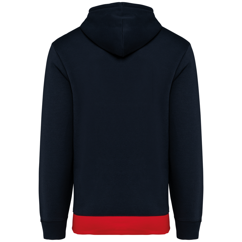 80 % katoen/20 % polyester. Buitenoppervlak 100% gekamd katoen. Rechte snit. Aan de binnenkant geborsteld fleece 3 draden. LSF (Low Shrinkage Fleece). Enzymgewassen. Driekleurige sweater met capuchon met centrale witte streep op alle kleuren. Afwerking ribboord 1x1 aan mouwuiteinde en aan de onderkant in kokervorm voor een betere afwerking, met stiksel. Kangoeroezak met dubbel stiksel. Capuchon met plooien, oogje en metalen koorduiteinden, met ronde aanrijgkoordjes Toon-op-toon nektape met visgraatmotief. In de mouwuiteinden en onderaan zit elastaan om vervorming van het kledingstuk te voorkomen. Halvemaanvormige afwerking op de achterkant voor eenvoudige personalisatie. Afscheurbaar merklabel en maatlabel in de kraag voor eenvoudige personalisatie.