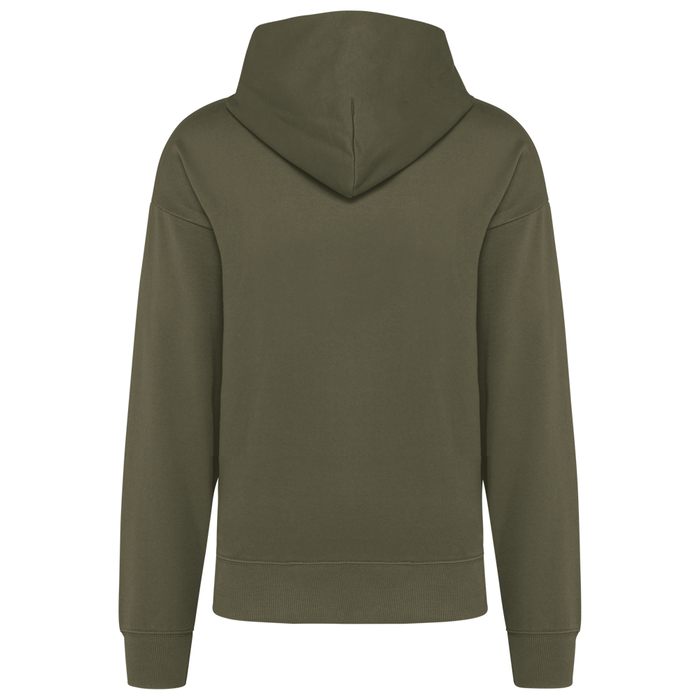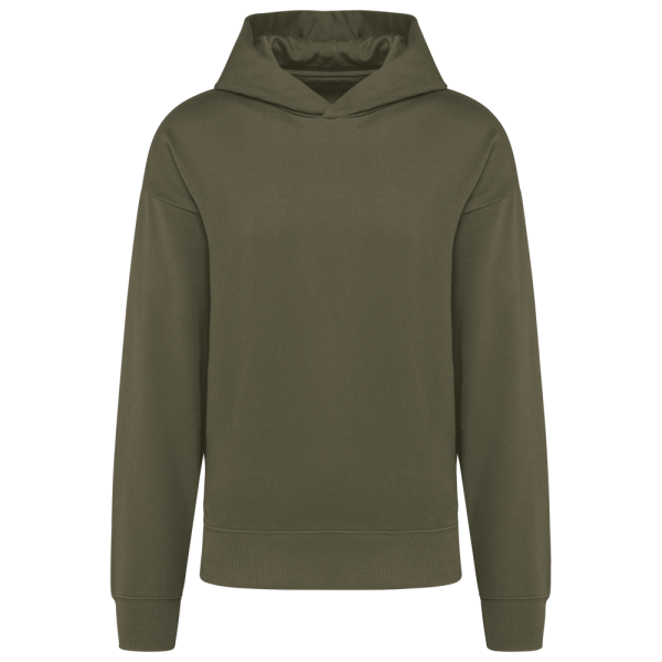 80% katoen / 20% polyester. Oversized model met afhangende schouders. Geborsteld fleece aan de binnenkant. Gekaard katoen. 2x1 ribboord in buisconstructie voor een betere afwerking aan de mouwuiteinden en de onderkant. Verborgen zak met blinde rits in de zijnaad rechts (wanneer gedragen). Gevoerde katoenen capuchon met plooi. In de ribboord aan de mouwuiteinden en onderaan zit elasthaan om vervorming van het kledingstuk te voorkomen. Toon-op-toon nektape met visgraatmotief. Halvemaan in de kraag. Dubbel stiksel aan weerszijden, op de mouwuiteinden en onderaan. Geen merklabel, maar een maatlabel in de kraag voor eenvoudige personalisatie.