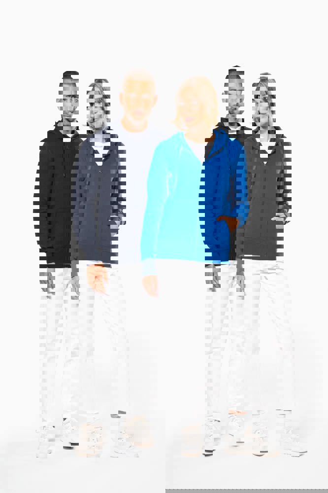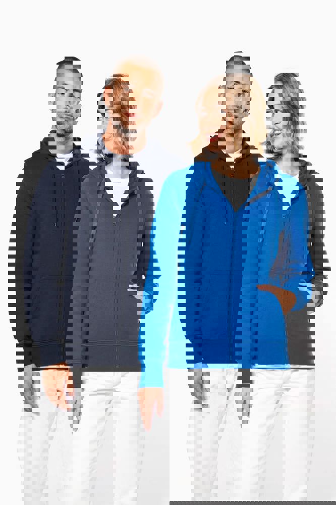 85% katoen / 15% polyester. Gemaakt van 85% biologisch katoen en 15% gerecycled polyester. Buitenoppervlak 100% katoen. Geborsteld fleece 3 draden LSF (Low Shrinkage Fleece) aan de binnenkant. Gekamd katoen. Enzymgewassen. Rechte snit. Kangoeroezakken. Ritssluiting in toon-op-toon nylon. Gevoerde capuchon 100% katoen, jerseykatoen 180 g. 1x1 ribboord in buisconstructie voor een betere afwerking aan de mouwuiteinden en de onderkant. Nektape in toon-op-toon jersey en halvemaanvormige afwerking aan de binnenkant van de kraag. Afwerking dubbel stiksel aan mouwuiteindenn, onderkant en hals. Geen merklabel in de kraag, maar enkel een maatlabel voor eenvoudige personalisatie.