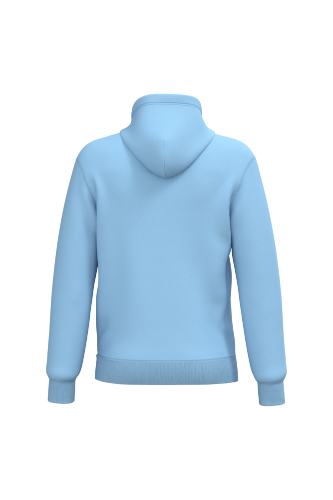 50% ringgesponnen katoen / 50% gerecycled polyester post-consumer. Geborsteld fleece aan de binnenkant. Straight snit. Cut-and-sew-techniek. 2x1 ribboord in buisconstructie voor een betere afwerking aan de hals, de mouwuiteinden en de onderkant. Kangoeroezak. Gevoerde capuchon in jersey-polykatoen met platte aanrijgkoordjes. Ton-sur-ton nektape in jersey in de kraag. Geen merklabel in de kraag, maar enkel een maatlabel voor eenvoudige personalisatie.