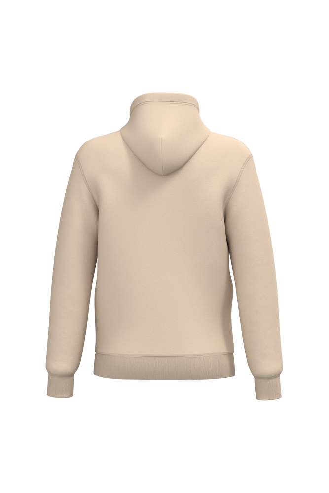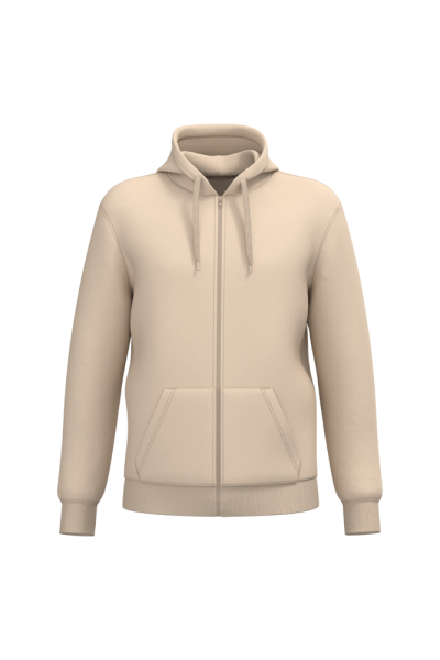 50% ringgesponnen katoen / 50% gerecycled polyester post-consumer. Geborsteld fleece aan de binnenkant. Straight snit. Cut-and-sew-techniek. 2x1 ribboord in buisconstructie voor een betere afwerking aan de hals, de mouwuiteinden en de onderkant. Kangoeroezak. Ritssluiting in nylon. Gevoerde capuchon in jersey-polykatoen met platte aanrijgkoordjes. Toon-op-toon nektape in jersey in de kraag. Geen merklabel in de kraag, maar enkel een maatlabel voor eenvoudige personalisatie.