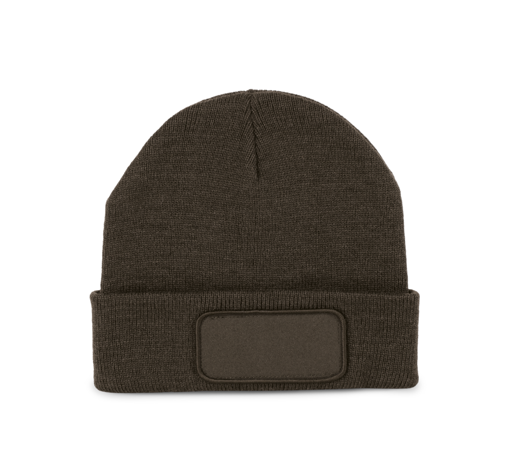 50% gerecycled polyester, 50% acryl. Muts met gebreide omslag in acryl en polyester. Katoenen patch aan de voorkant, voor eenvoudige personalisatie. Tear-away merklabel.