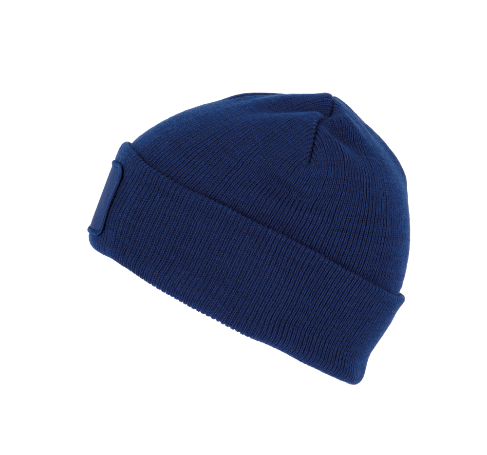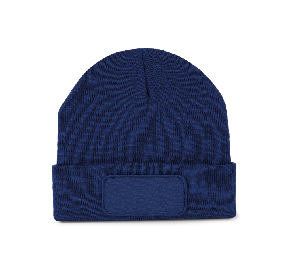 50% gerecycled polyester, 50% acryl. Muts met gebreide omslag in acryl en polyester. Katoenen patch aan de voorkant, voor eenvoudige personalisatie. Tear-away merklabel.