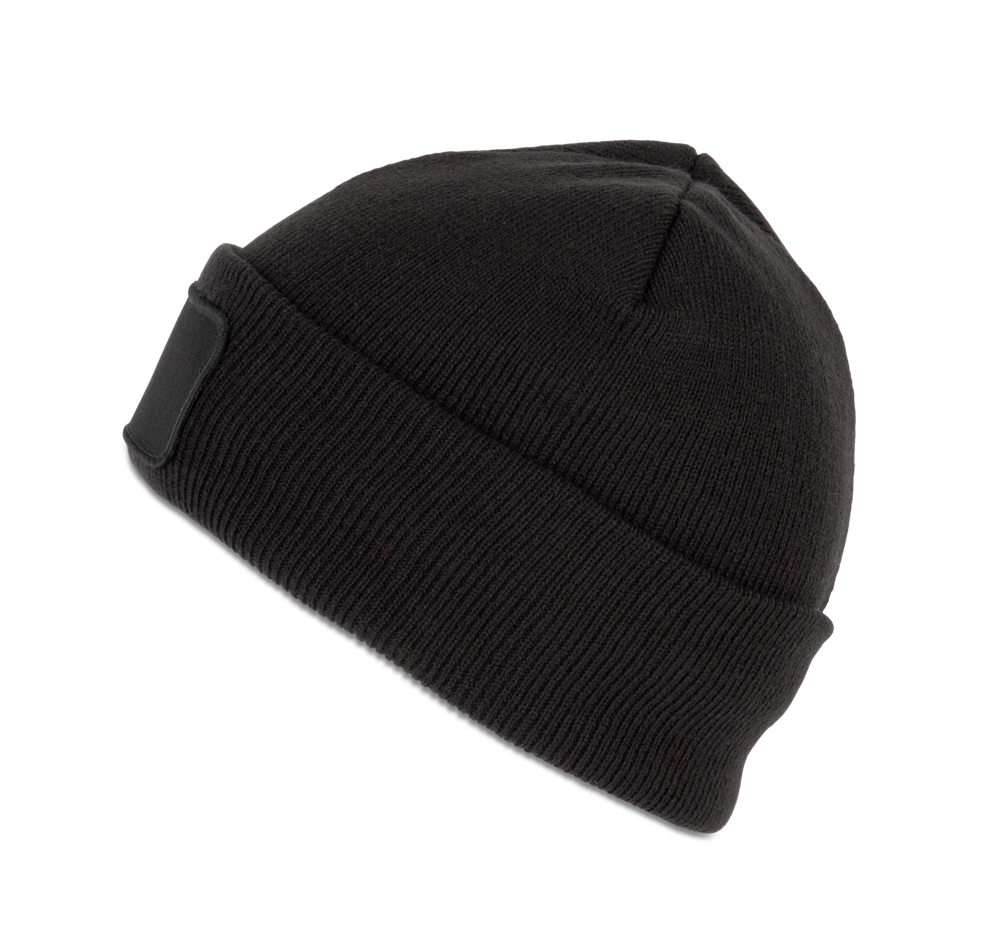 100% acryl. Gebreide muts met omslag in zacht acryl. Katoenen patch aan de voorkant, voor eenvoudige personalisatie. Heel comfortabele Thinsulate-fleecevoering. Tear-away merklabel.