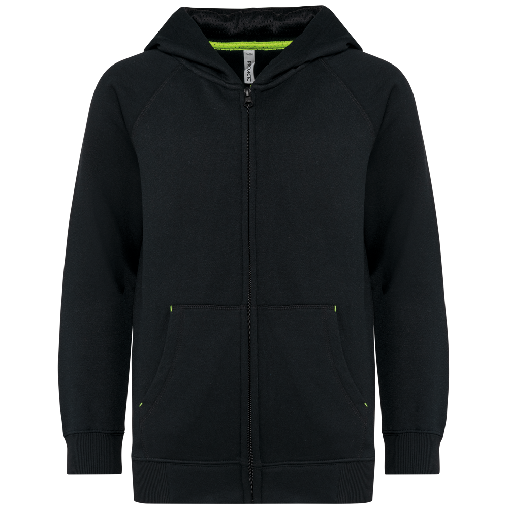 65% polyester / 35% katoen. Geborsteld fleece aan de binnenkant. Gekamd katoen. Vortex-garen. Rechte snit. Raglanmouwen. Nylon ritssluiting. Capuchon gevoerd met toon op toon mesh. Nektape aan de binnenkant van de capuchon en stoppunten in fluokleurtjes op de zakken. Kangoeroezakken met 1 fluorescerend gsm-zakje. Mouwboorden en onderzijde in 2x2 ribboord met dubbele dikte. Halvemaanvormige halsopening op de achterkant, voor eenvoudige personalisatie van het merk aan de binnenkant. Tear-away merklabel.