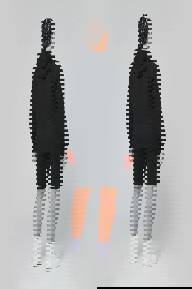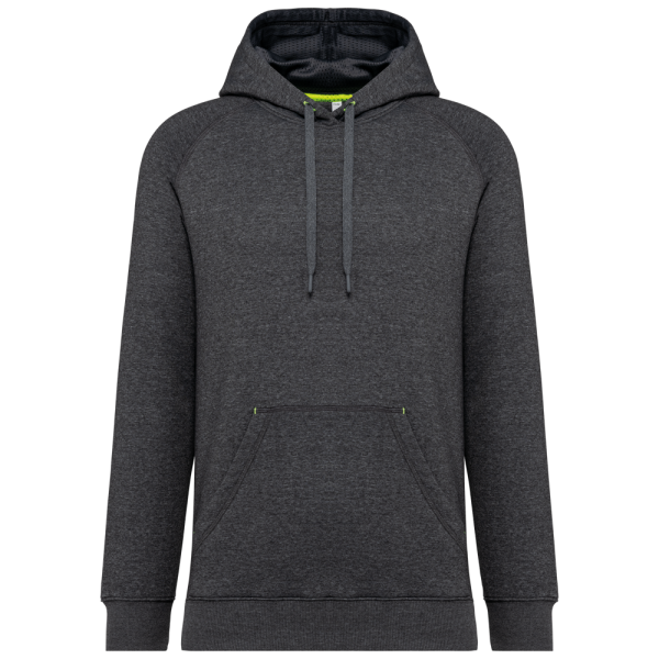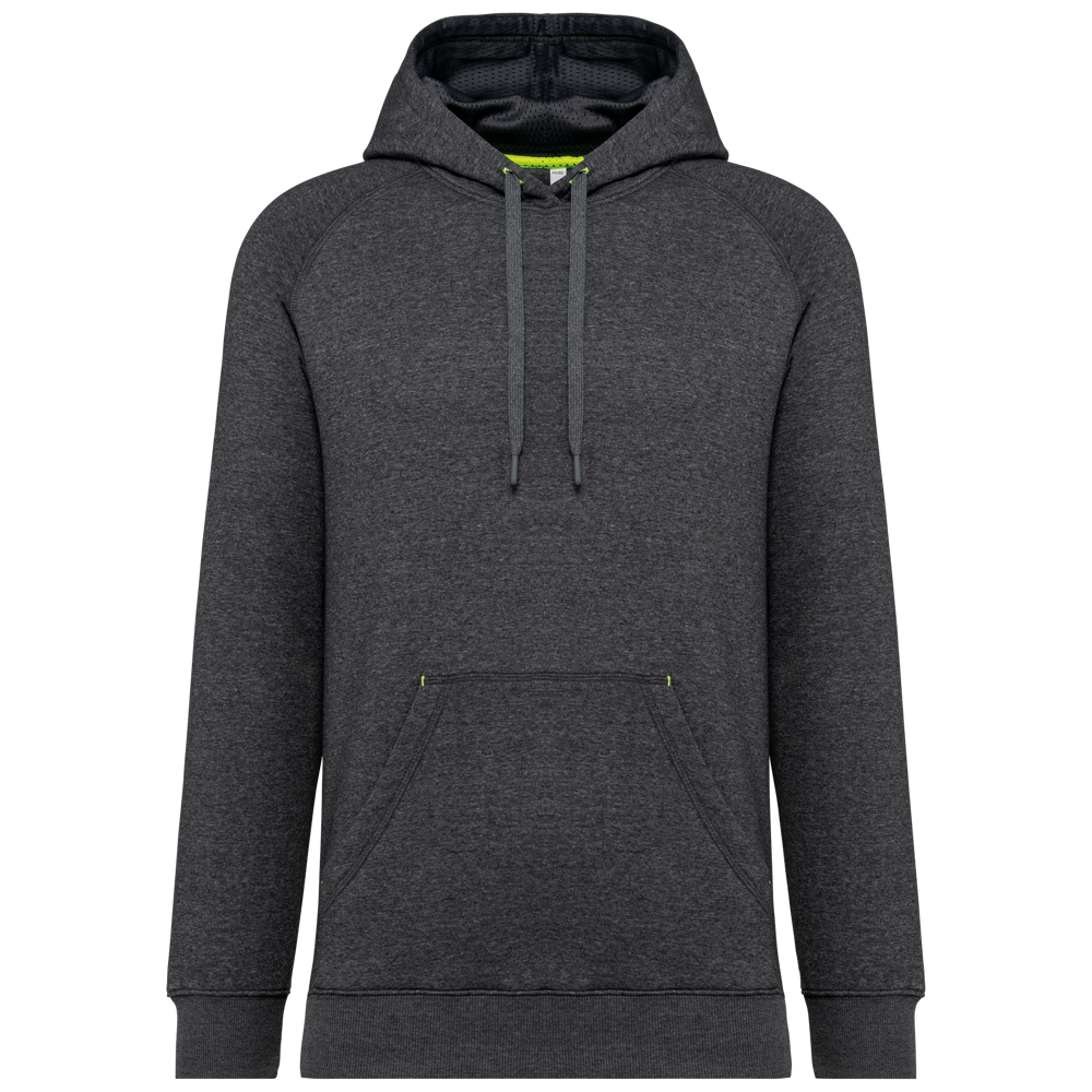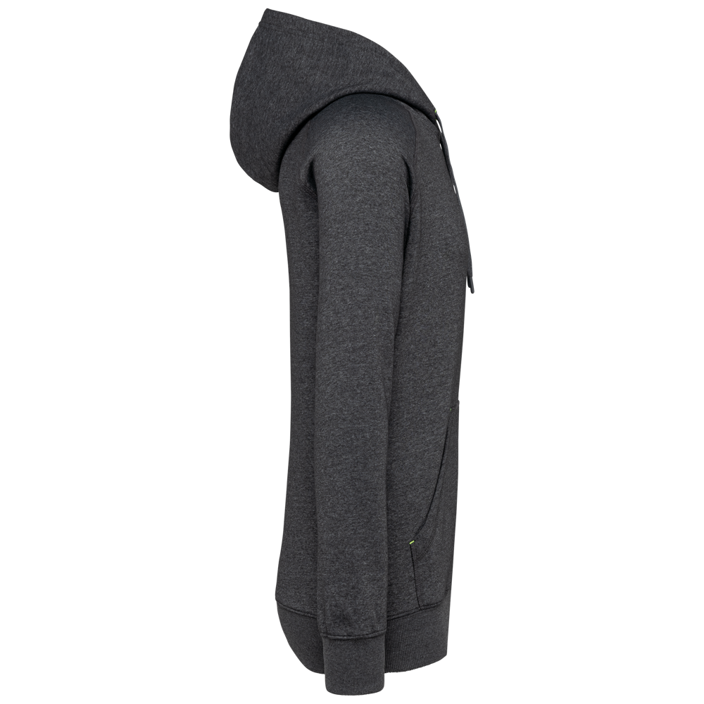65% polyester / 35% katoen. Vortex-garen. Geborsteld fleece aan de binnenkant. Gekamd katoen. Rechte snit. Raglanmouwen. Capuchon gevoerd met toon op toon mesh. Nektape aan de binnenkant van de capuchon, ringetjes voor de koordjes van de capuchon en stoppunten in fluokleurtjes op de zakken. Kangoeroezakken met 1 fluorescerend gsm-zakje. Mouwboorden en onderzijde in 2x2 ribboord met dubbele dikte. Halvemaanvormige halsopening op de achterkant, voor eenvoudige personalisatie van het merk aan de binnenkant. Tear-away merklabel.