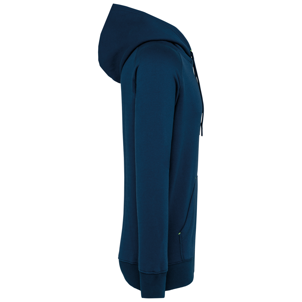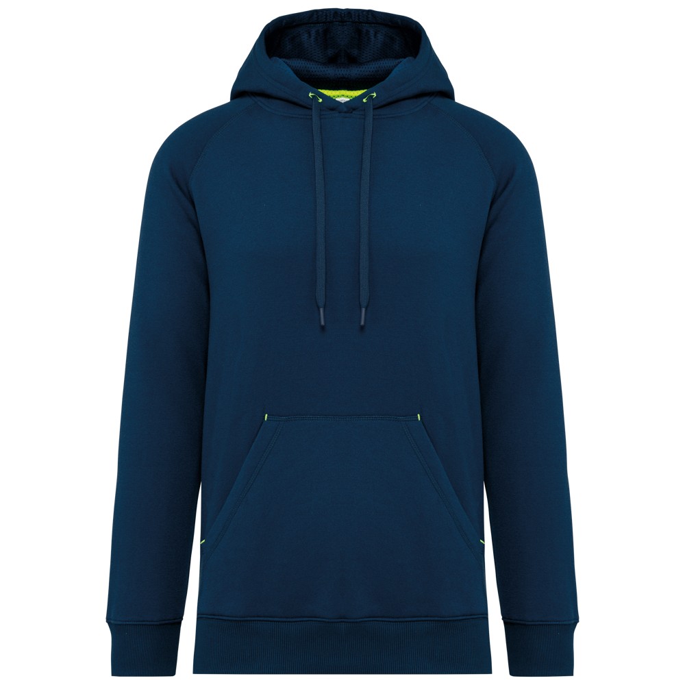 65% polyester / 35% katoen. Vortex-garen. Geborsteld fleece aan de binnenkant. Gekamd katoen. Rechte snit. Raglanmouwen. Capuchon gevoerd met toon op toon mesh. Nektape aan de binnenkant van de capuchon, ringetjes voor de koordjes van de capuchon en stoppunten in fluokleurtjes op de zakken. Kangoeroezakken met 1 fluorescerend gsm-zakje. Mouwboorden en onderzijde in 2x2 ribboord met dubbele dikte. Halvemaanvormige halsopening op de achterkant, voor eenvoudige personalisatie van het merk aan de binnenkant. Tear-away merklabel.