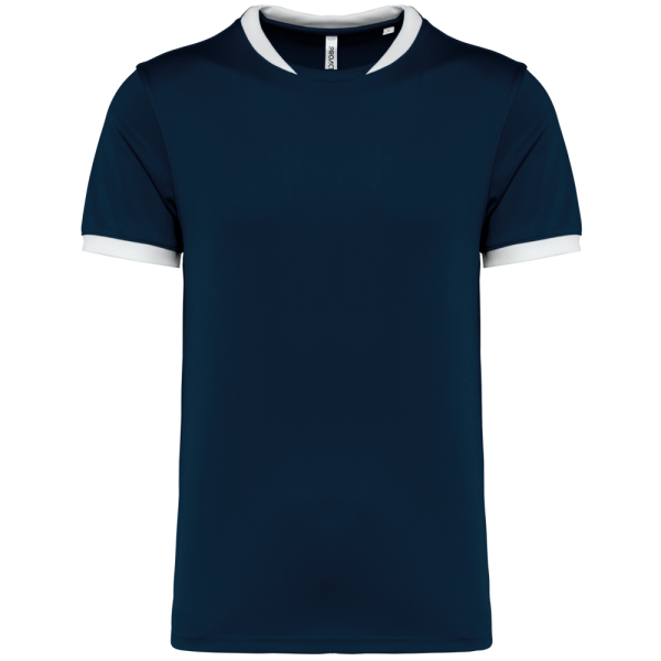 100% polyester. Interlock. Rechte snit. Cut-and-sew-techniek. Ronde hals in 1x1 ribtricot in contrasterend wit voor alle kleuren, met toon-op-toon interlock-inzetsel. Mouwuiteinden in 1x1 ribtricot in contrasterend wit voor alle kleuren. Toon-op-toon nektape van interlock. Verstevigde naden met dubbel stiksel aan de mouwuiteinden, de schouders en aan de zijkanten. Afwerking met dubbel stiksel aan de onderkant. Afneembaar merklabel.
