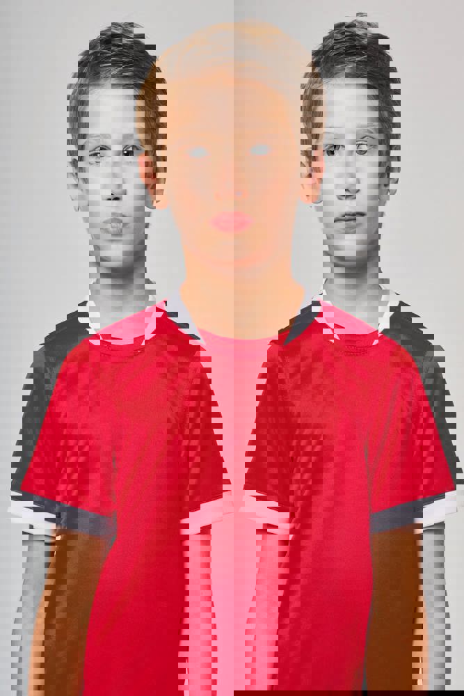 100% polyester. Interlock. Rechte snit. Cut-and-sew-techniek. Ronde hals in 1x1 ribtricot in contrasterend wit voor alle kleuren, met toon-op-toon interlock-inzetsel. Mouwuiteinden in 1x1 ribtricot in contrasterend wit voor alle kleuren. Toon-op-toon nektape van interlock. Verstevigde naden met dubbel stiksel aan de mouwopeningen, de schouders en opzij. Afwerking met dubbel stiksel onderaan. Afneembaar merklabel.