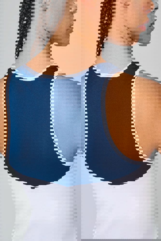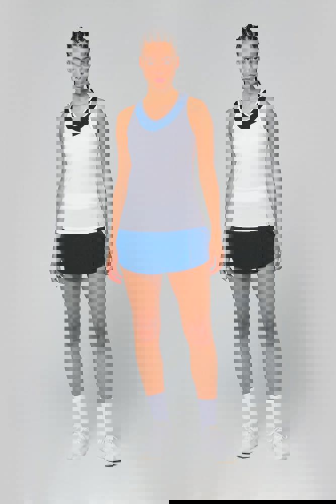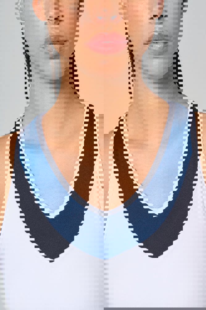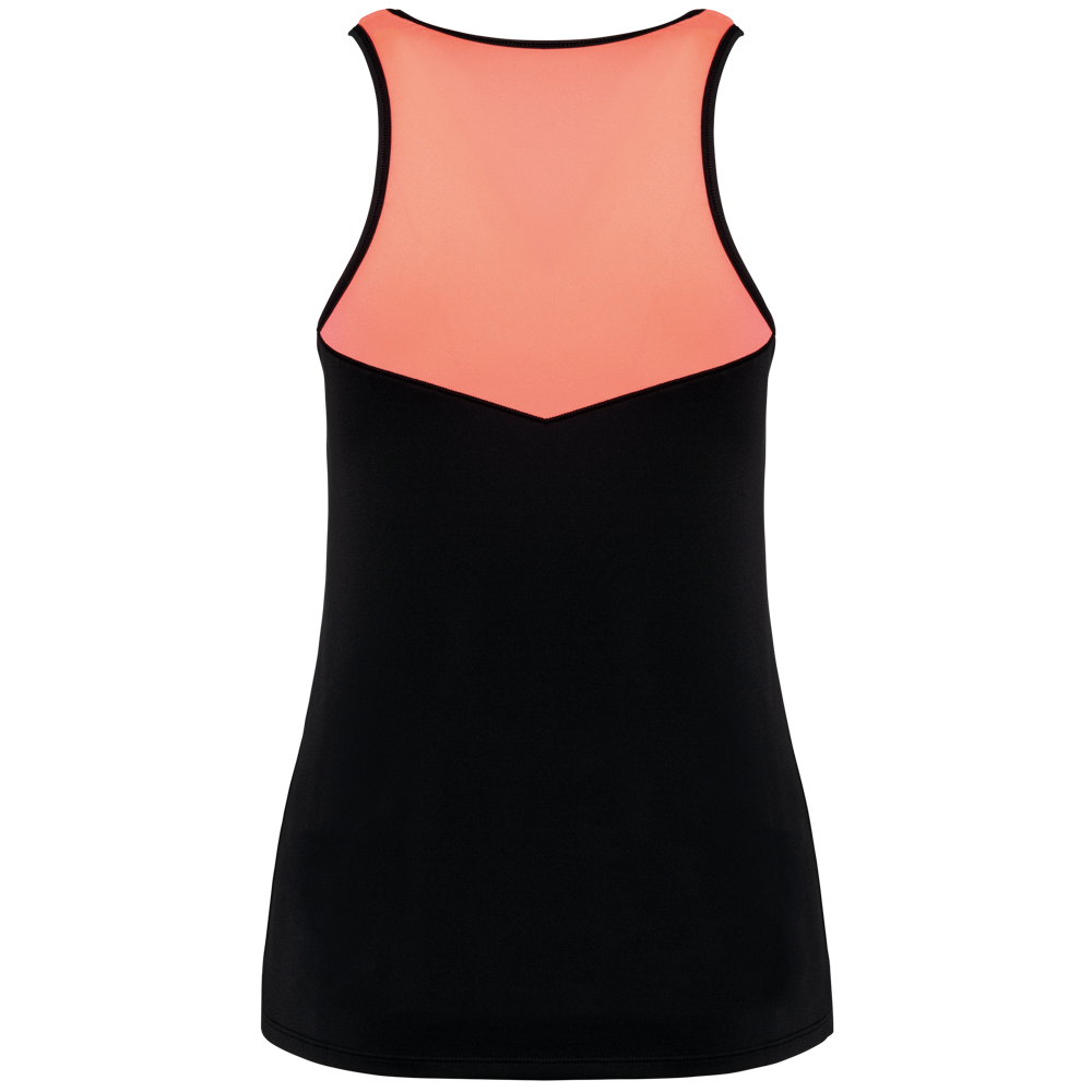 80% polyester / 20% elasthan. Contrasterende inzetsels : 90% polyester / 10% elasthan. In jersey. Slim fit. Diepe halsopening. Afgewerkt met een biesje aan de halsopening en de mouwopeningen, en een dubbel stiksel aan de onderkant. Tear-away merklabel.