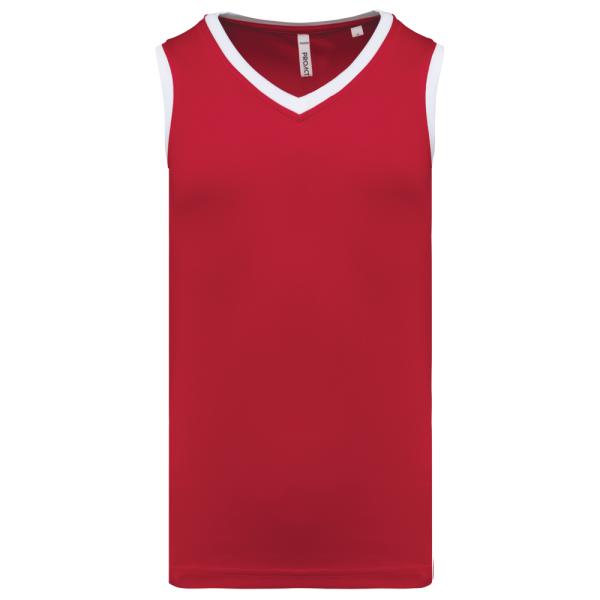 100% birdseye-polyester. V-hals. Contrasterend biesje aan hals en armsgaten. Dubbel stiksel op de zoom onderaan. Afneembaar merklabel.