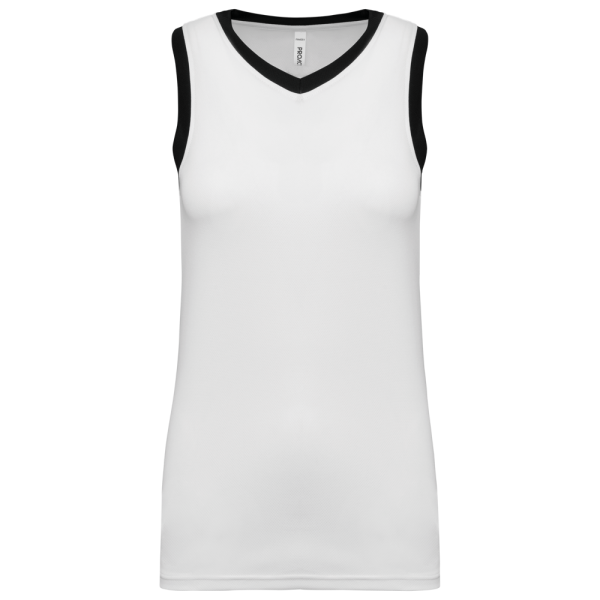 100% birdseye-polyester. V-hals. Contrasterend biesje aan hals en armsgaten. Dubbel stiksel op de zoom onderaan. Afneembaar merklabel.