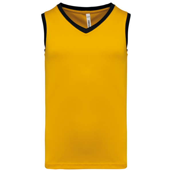 100% birdseye-polyester. V-hals. Contrasterend biesje aan hals en armsgaten. Dubbel stiksel op de zoom onderaan. Afneembaar merklabel.