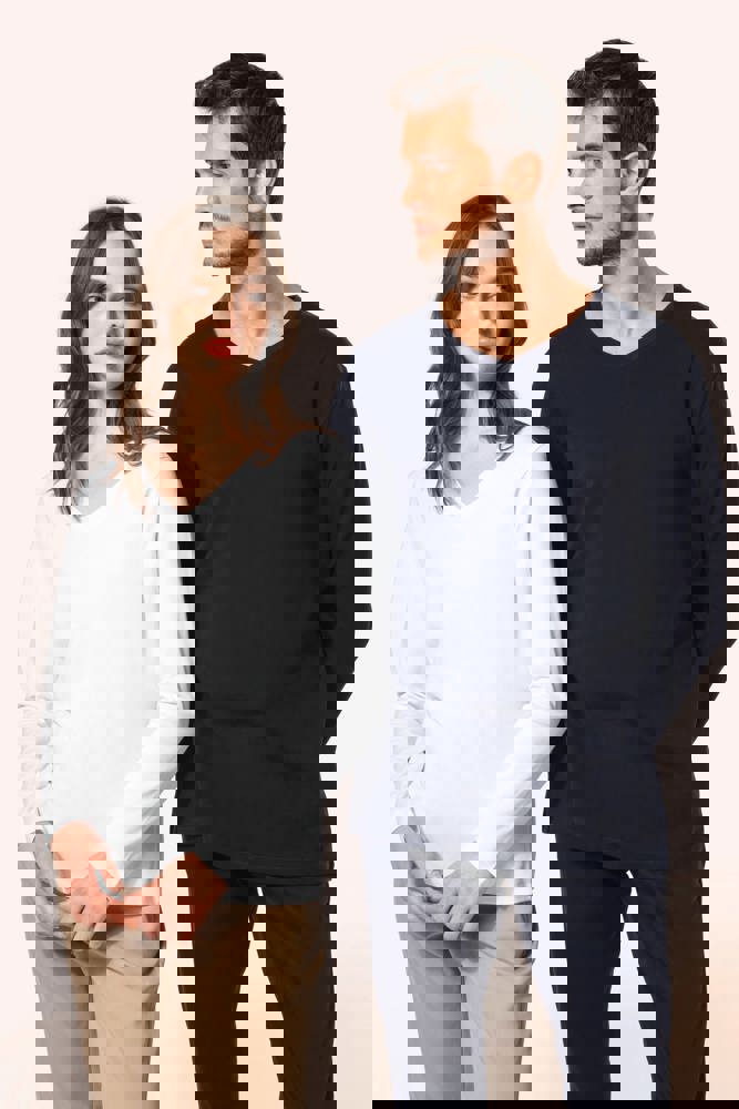 100% katoen. Tricot van gekamd Supima® katoen. Heel fijne, zachte en zijdeachtige jersey van grote kwaliteit. Gesneden en genaaide constructie. V-hals met ton-sur-ton nektape. Versteviging van de schoudernaad met een silicone bandje. De mouwuiteinden en onderkant zijn afgewerkt met een zoompje met dubbel stiksel. Geen merklabel in de kraag, maar enkel een maatlabel voor eenvoudige personalisatie.