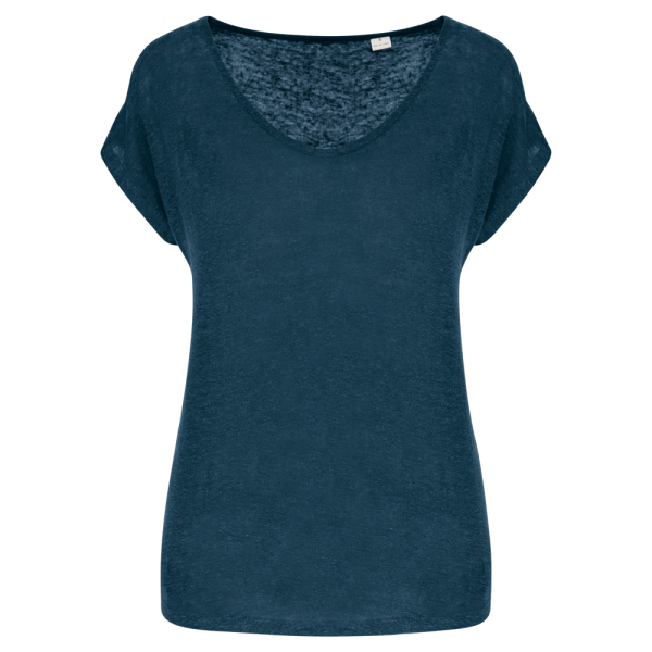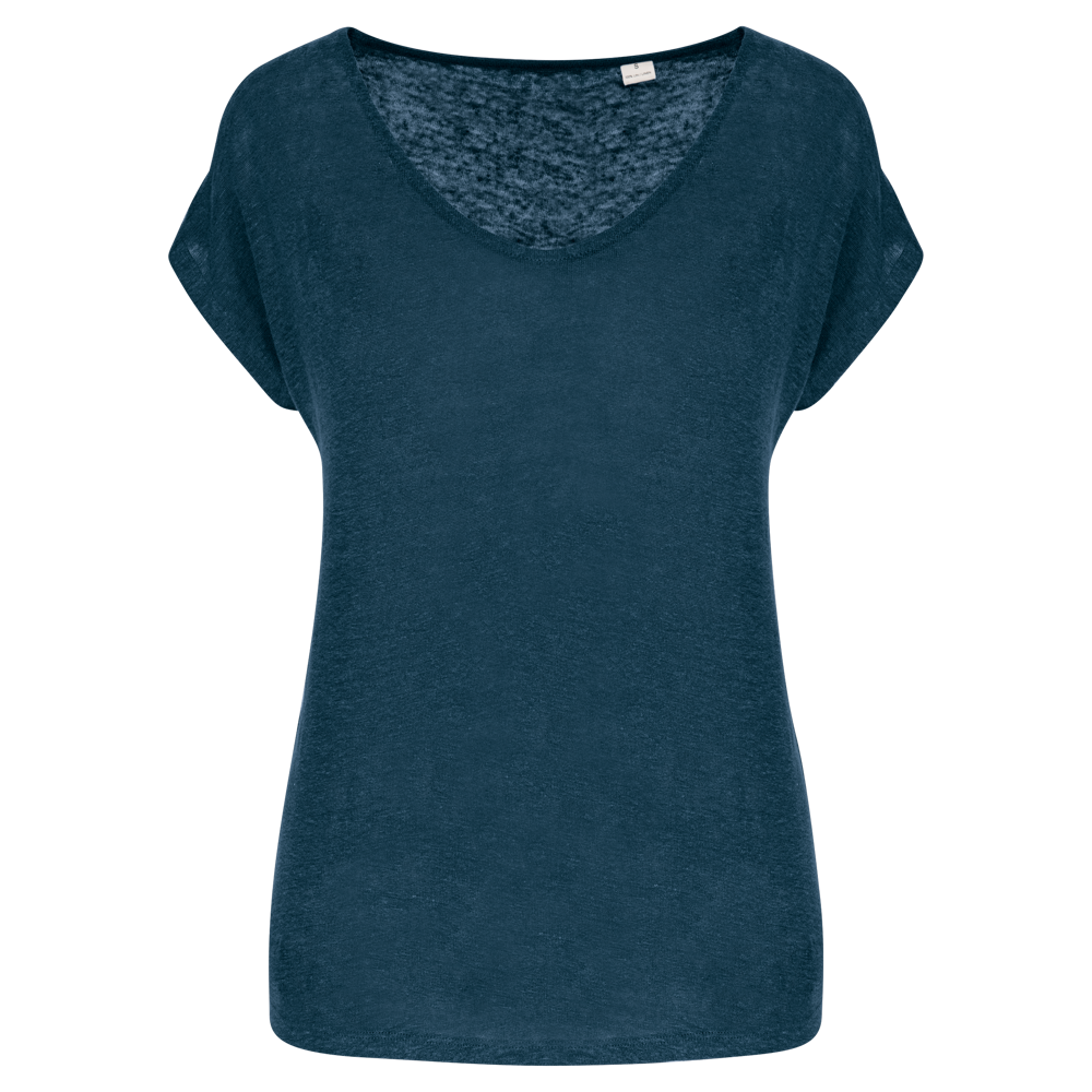 100 % Linnen. Tricot. Rechte snit. Zijnaden. Hals in de hoofdstof. Nektape in de hoofdstof in de kraag. Zoom met dubbel stiksel aan de mouwuiteinden en onderkant.