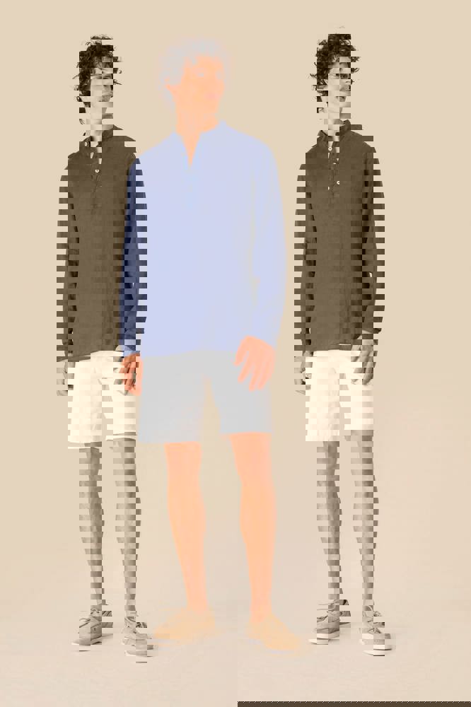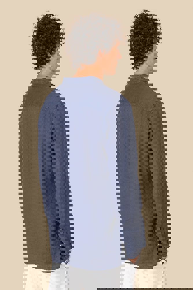 100% linnen. Geweven. Rechte snit. Verwassen look. Maokraag. Opgezette knooplijst met contrasterende parelmoerlook knopen van gerecycled plastic. Knopen op de polsband met verstelbaar uiteinde. Dubbel inzetsel op de rug. Zoom met enkel stiksel onderaan. Licht afgeronde onderkant en afwerking met driehoekje aan de zijkant voor meer stevigheid. Kledingstuk geverfd na montage: mogelijk zijn er lichte kleurverschillen tussen de producten. Dit product kan afgeven in contact met lichtere stoffen of kleding.