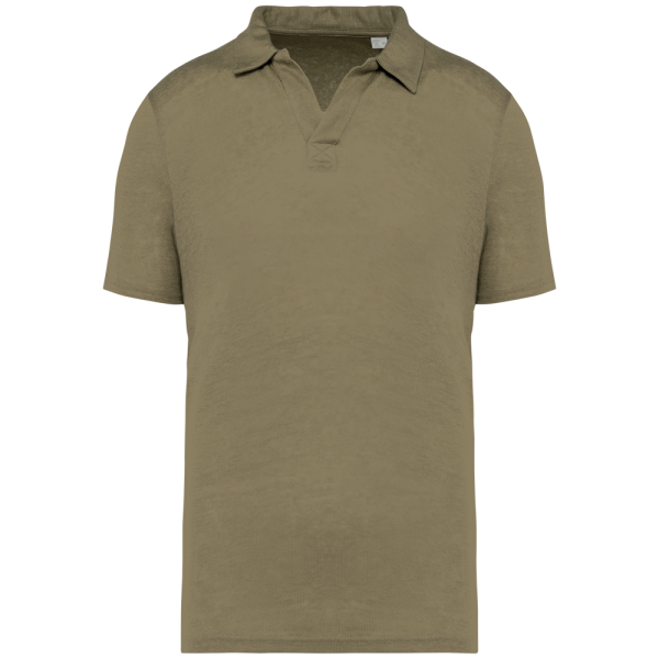 100 % linnen. Tricot. Rechte snit. Polokraag met staander en V-hals. met knooplijst zonder knoop in de hoofdstof. Dubbel stiksel aan de mouwboorden en de zoom. Zijsplitten met aan de binnenkant nektape in de hoofdstof. Halvemaan op de achterkant.
