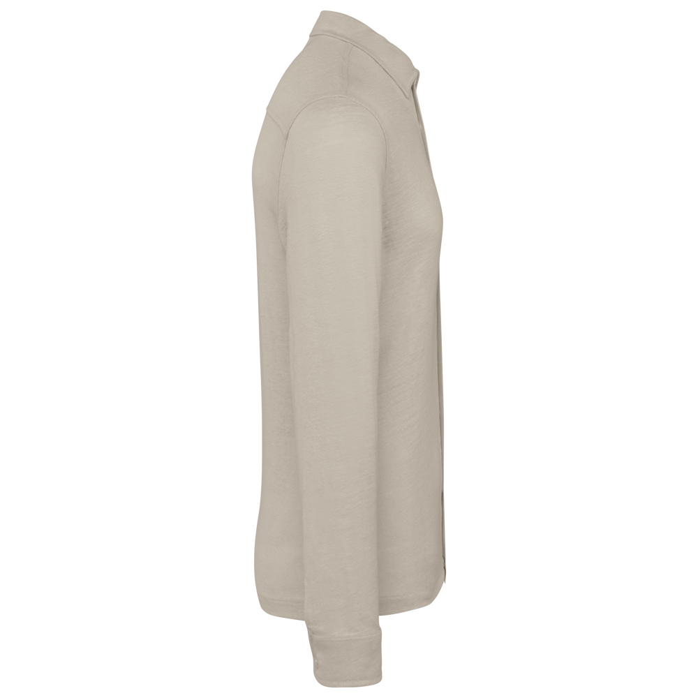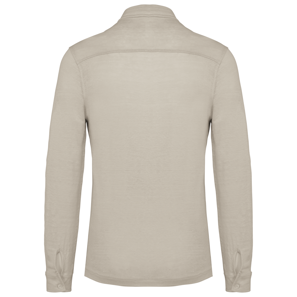 100% linnen. Tricot. Rechte snit. Kraag met staander. Inzetsel op de rug. Manchet met knoop en split. Knooplijst met contrasterende knopen in gerecycled plastic met parelmoerlook voor alle kleuren. Enkel stiksel op de zoom onderaan.