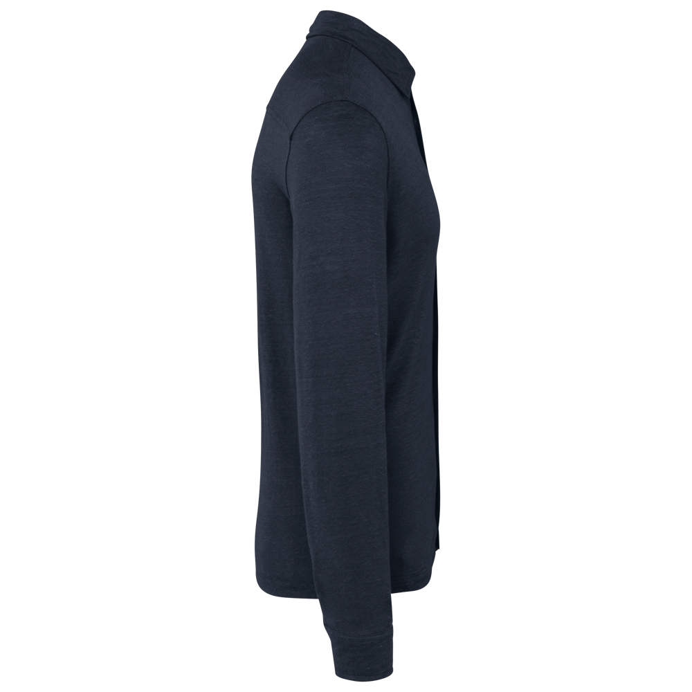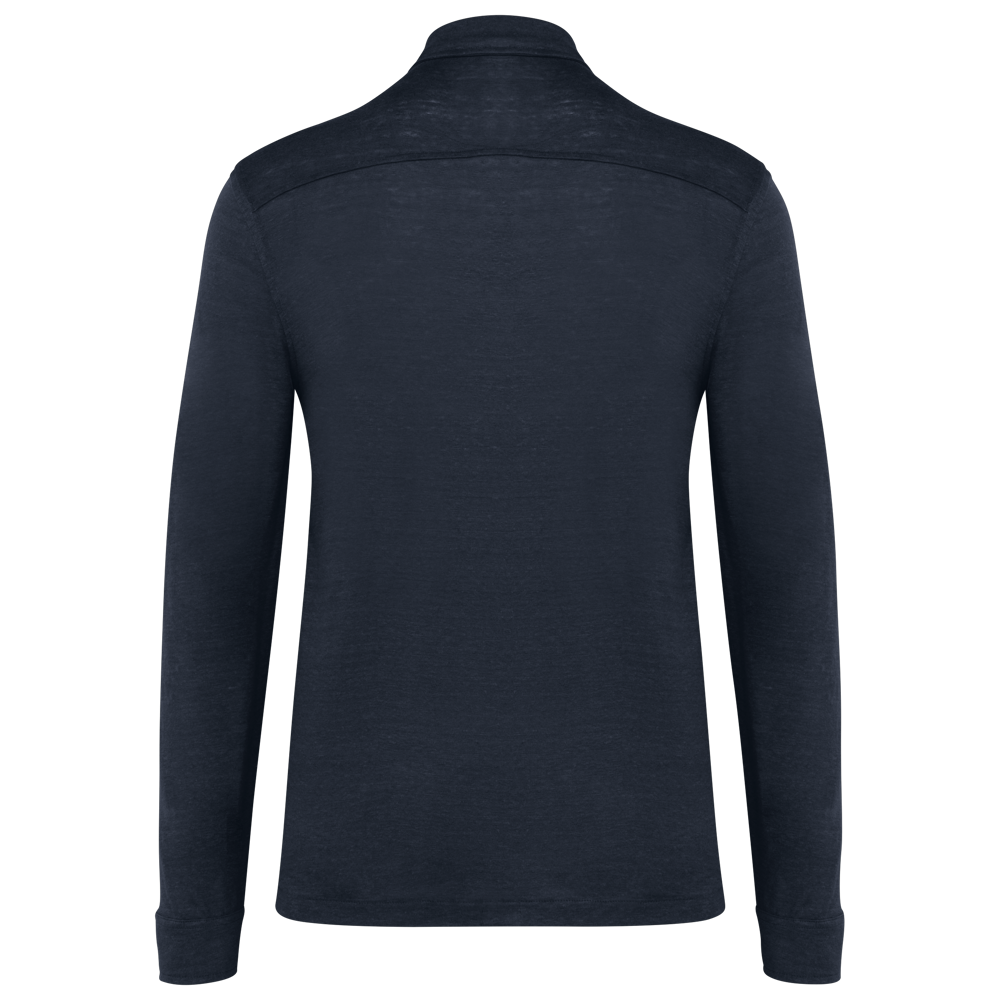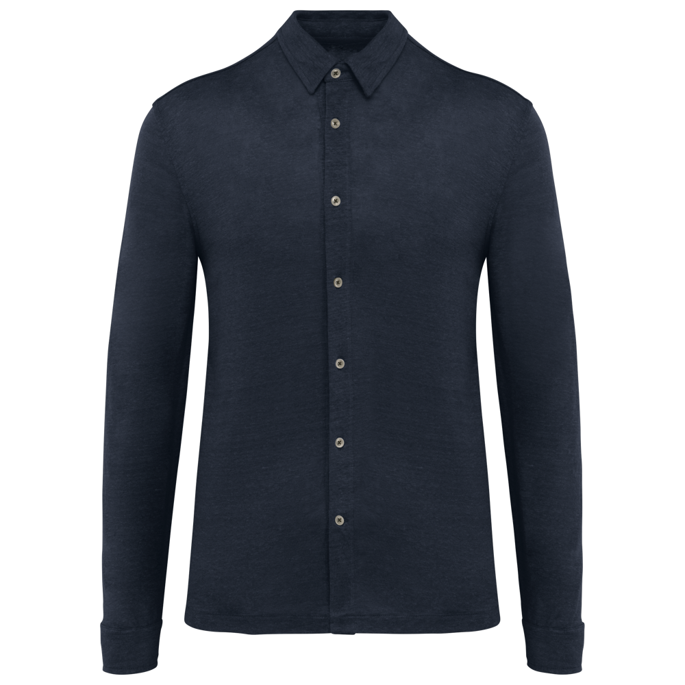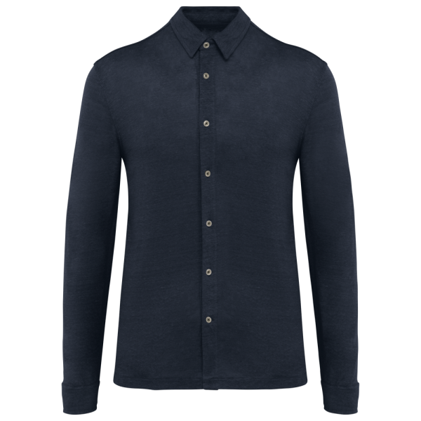 100% linnen. Tricot. Rechte snit. Kraag met staander. Inzetsel op de rug. Manchet met knoop en split. Knooplijst met contrasterende knopen in gerecycled plastic met parelmoerlook voor alle kleuren. Enkel stiksel op de zoom onderaan.