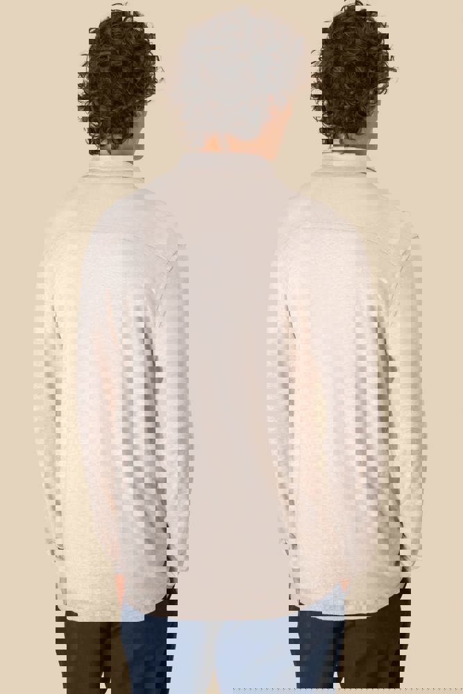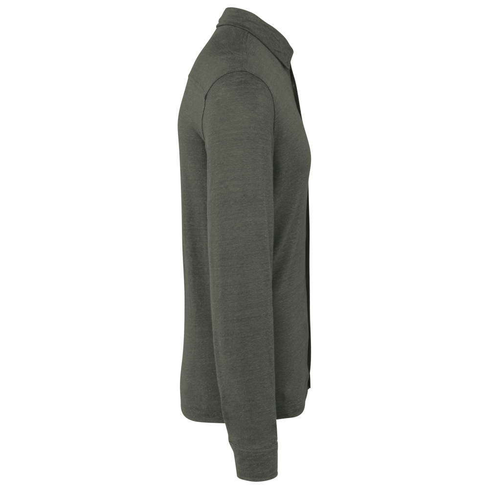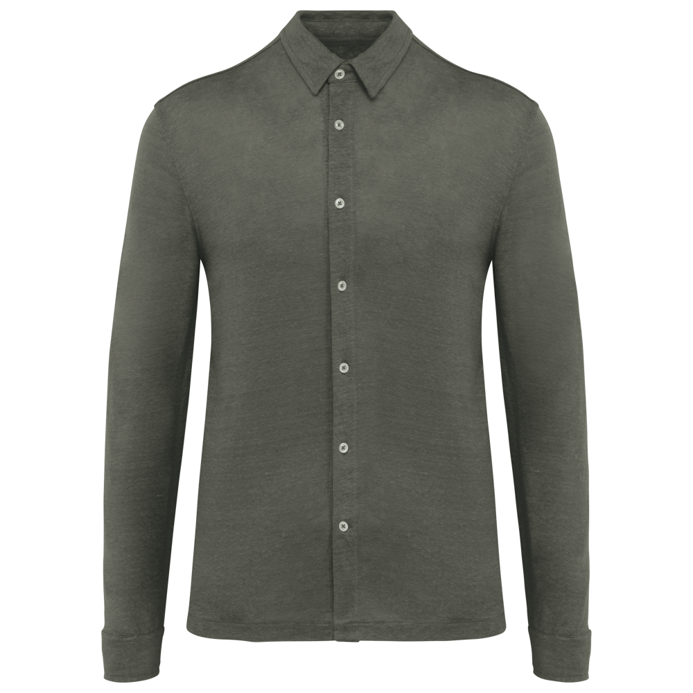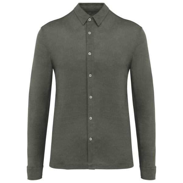 100% linnen. Tricot. Rechte snit. Kraag met staander. Inzetsel op de rug. Manchet met knoop en split. Knooplijst met contrasterende knopen in gerecycled plastic met parelmoerlook voor alle kleuren. Enkel stiksel op de zoom onderaan.