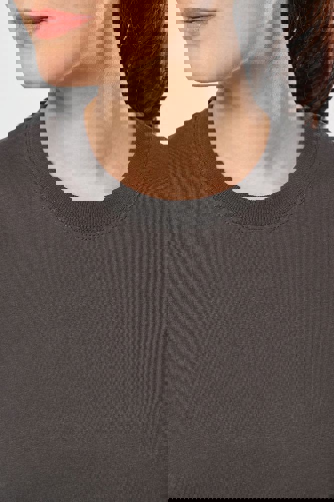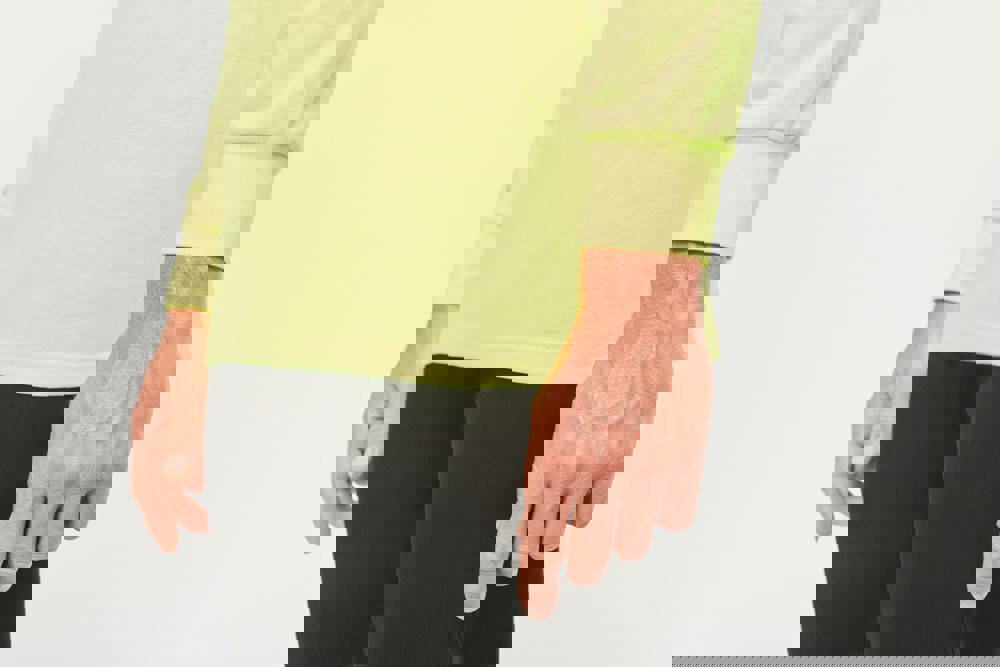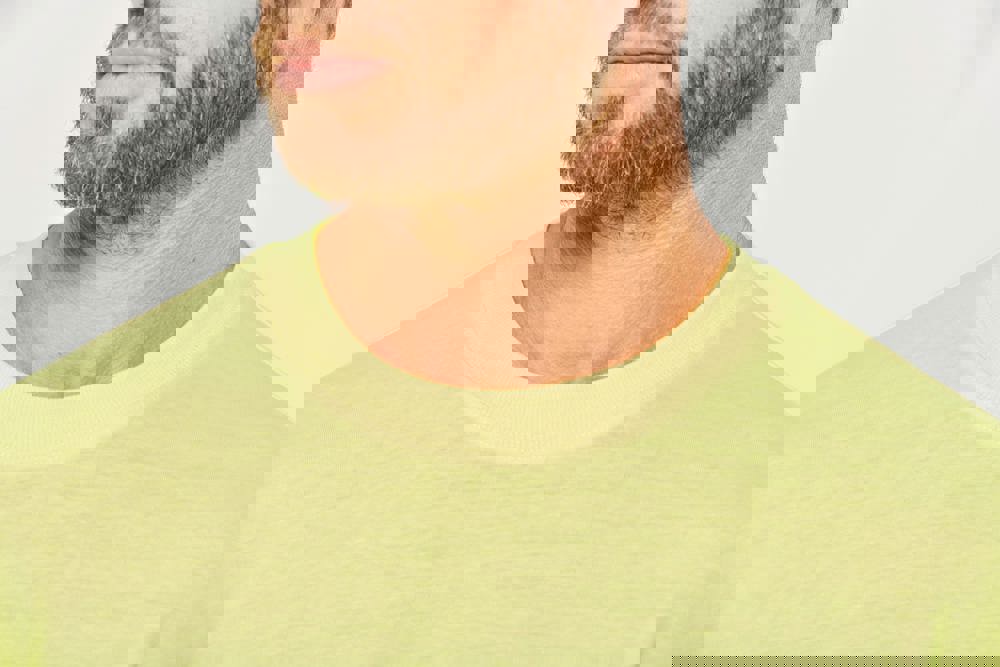 Effen kleuren: 100% katoen. Gemaakt van 100% biologisch katoen. Gevlamde kleuren: 90% katoen / 10% viscose. Gemaakt van 90% biologisch katoen. Fluokleuren: 65% polyester / 35% katoen. Gemaakt van 65% gerecycleerd polyester. Regular fit. Ronde halsopening in 2x1 ribboord met elasthan en silver nektape op de effen en heather kleuren en toon-op-toon op de fluokleuren. Afwerking met dubbel stiksel onderaan. Tear-away merklabel.