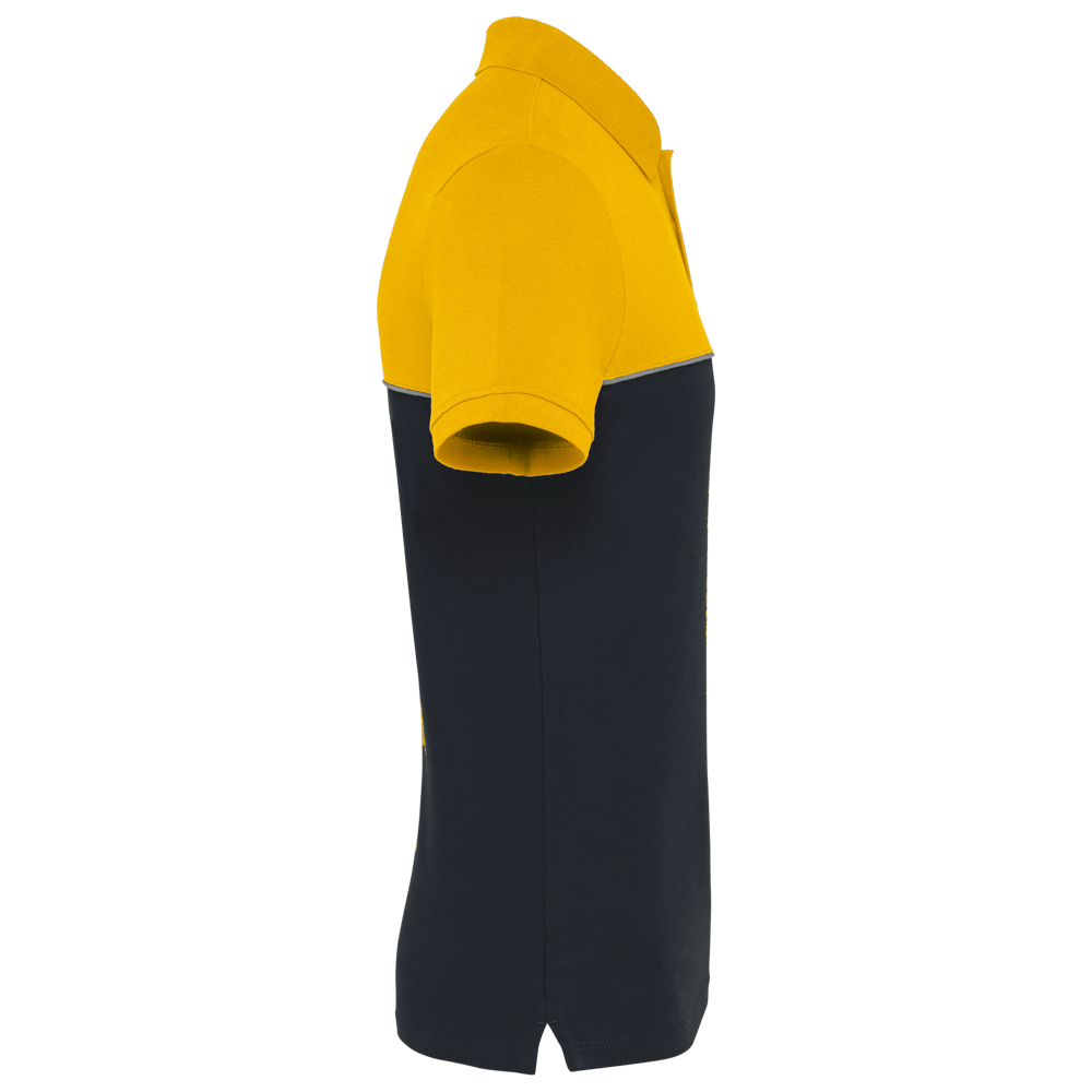 60% katoen / 40% polyester. Gemaakt van 60% gekamd katoen en 40% gerecycleerd polyester. Vortex-garen. Piquétricot. Anti-pluisbehandeling. Wasbaar op 60 °C. Rechte snit. Toon-op-toon lijst met 2 knopen. Kraag in 1x1 ribboord met contrasterende nektape met visgraatmotief.Contrasterende bies tussen de tweekleurige delen van het kledingstuk (lichaam, voorkant mouwen en rug). Afgewerkt met ribboord aan de mouwuiteinden. Zijsplitten met contrasterend visgraatmotief. Afwerking met dubbel stiksel onderaan. Tear-away merklabel.