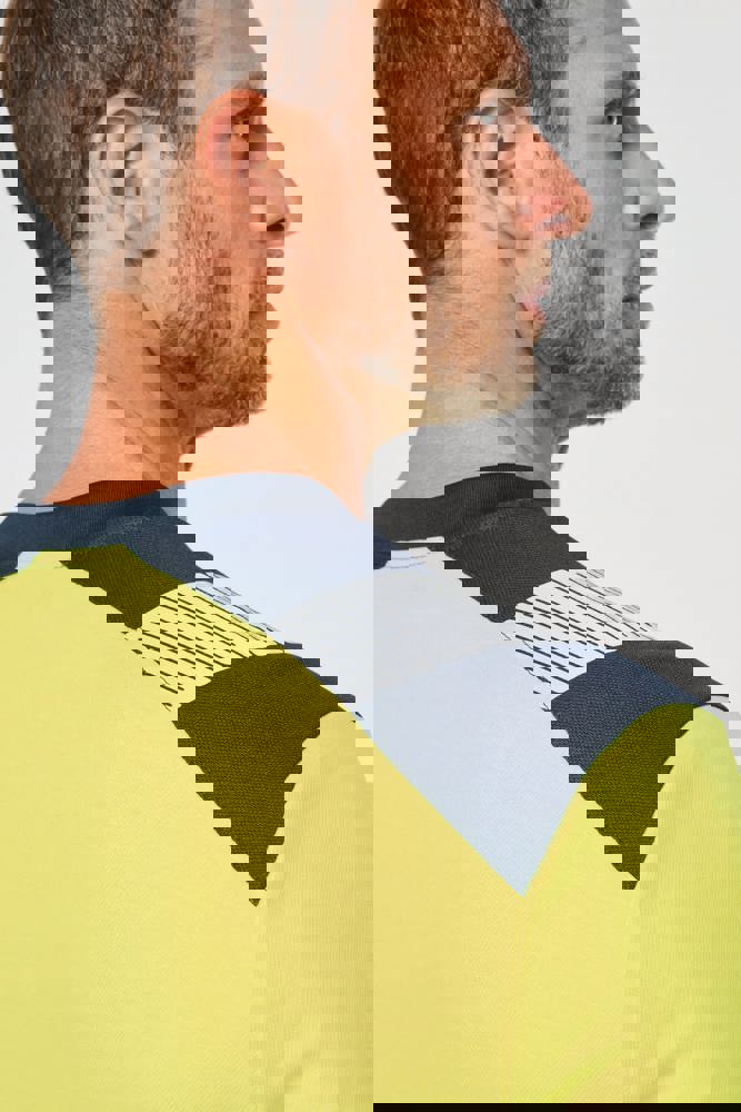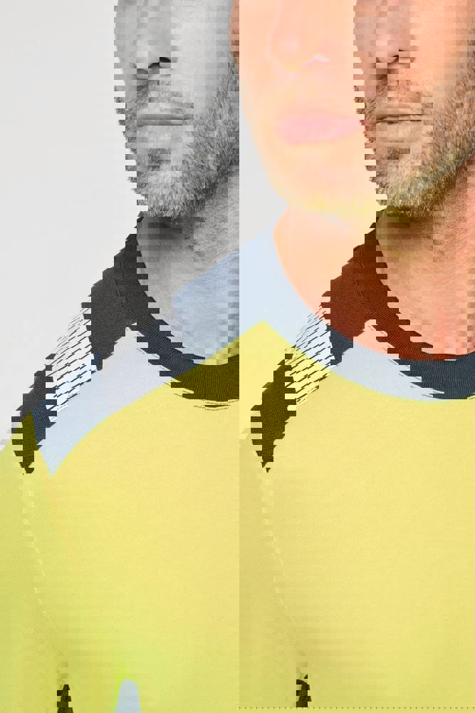 50% katoen / 50% gerecycled polyester. Gekamd katoen. Piquésteek. Anti-pilling behandeling. Wasbaar op 60°C (25 wasbeurten). Regular fit. Contrasterende schouderinzetten met een 5 cm brede segmentreflecterende band. Kraag gevoerd met 100% gerecycled polyester in 1x1 ribboord. Lange mouwen met contrasterende onderkant en 1x1 ribboord. Contrasterend en micro-geventileerd onderarmstuk van birdseye 100% gerecycled polyester. Twee segmentreflecterende banden van 5 cm aan de voor- en achterkant en op de mouwen. Contrasterende onderkant van het kledingstuk. Dubbel gestikte afwerking aan de onderkant van het kledingstuk. PBM Klasse II. Normen NF EN 13758-1+A1:2007 + NF EN 13758-2+A1:2007: UPF40+ bescherming tegen UV-straling, NF EN ISO 13688:2013 + NF EN ISO 13688/A1:2021 (Algemene eisen voor beschermende kleding), NF EN ISO 20471:2013 + NF EN ISO 20471/A1:2017: Klasse 2 (Hoge zichtbaarheid kleding - Testmethoden en eisen), RIS-3279-TOM Issue 2:2019 alleen voor de kleur Hi Viz Oranje/Marine (Spoorwegindustrie norm). Afneembaar merketiket.