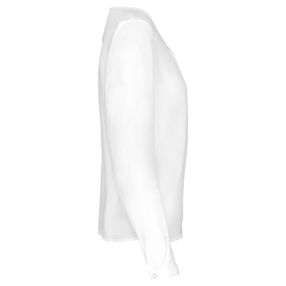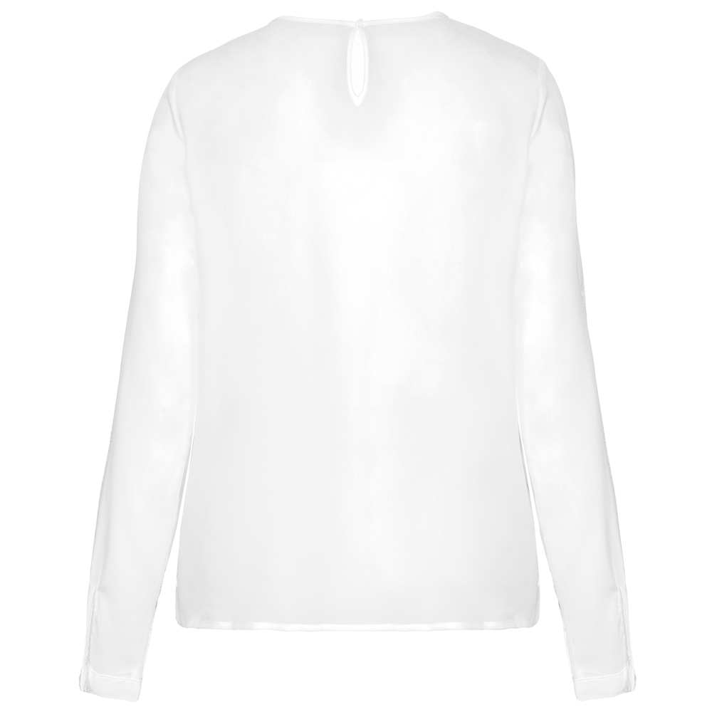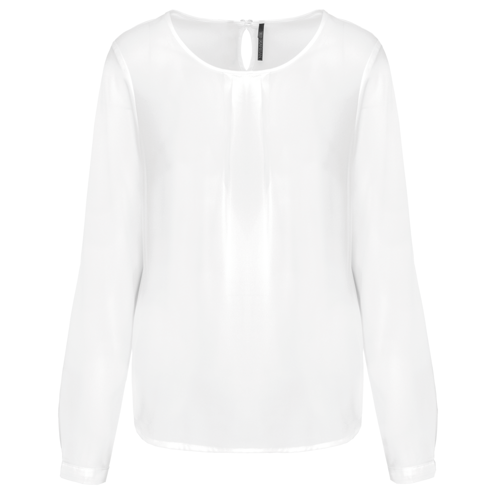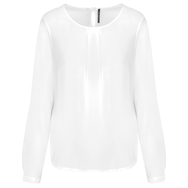 100% polyester. Soepele en lichte crêpe. Ronde hals met biesje. Fronsjes aan de halsopening aan de voorkant. Sluiting aan de achterkant en aan de onderkant van de mouwen door middel van een afgedekte knoop.