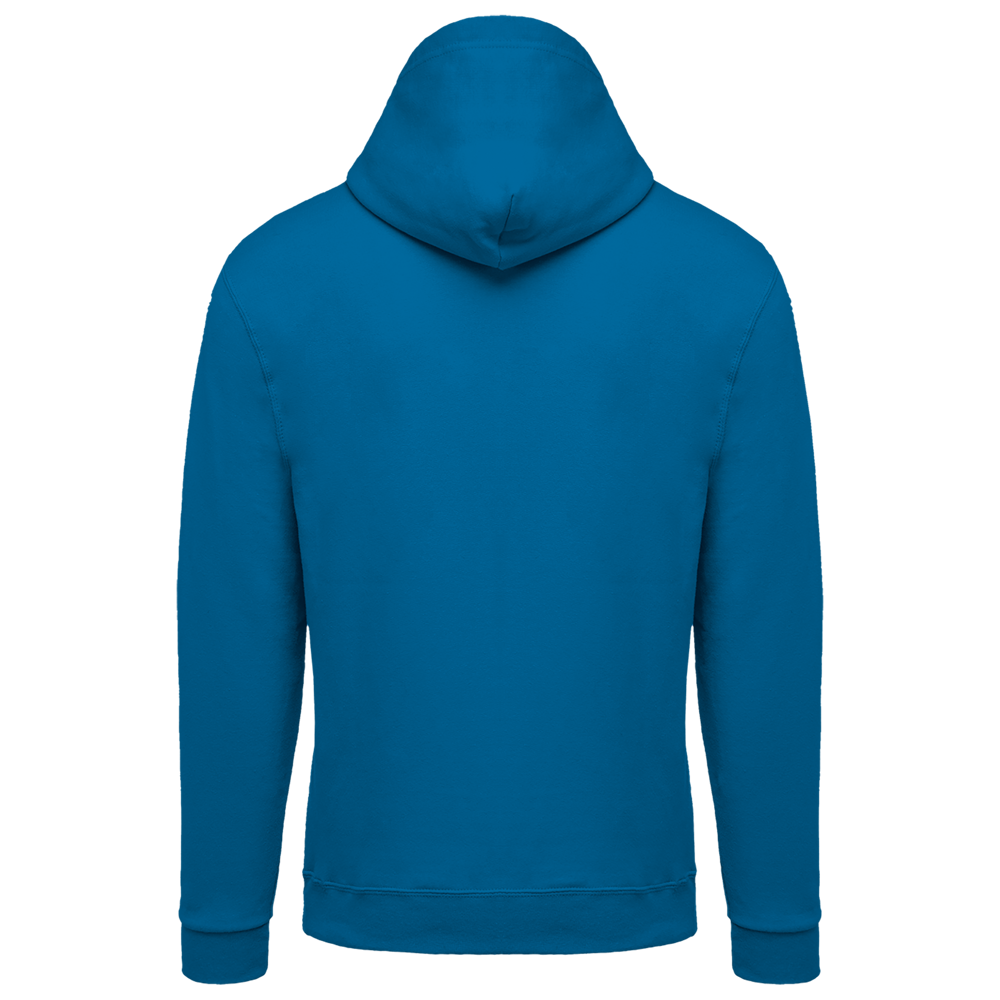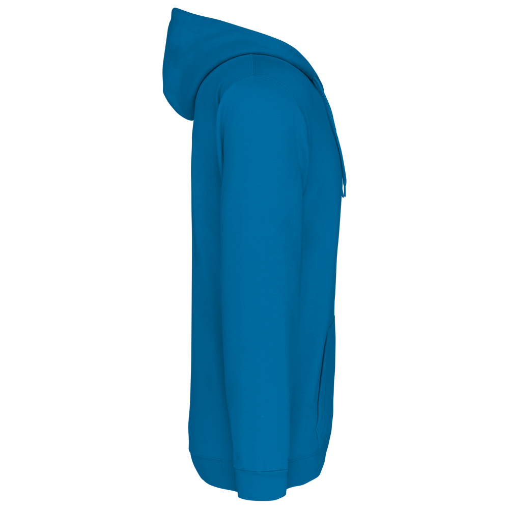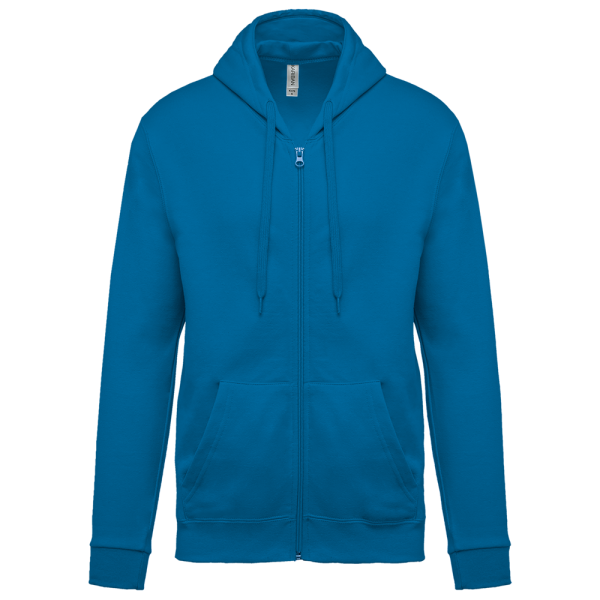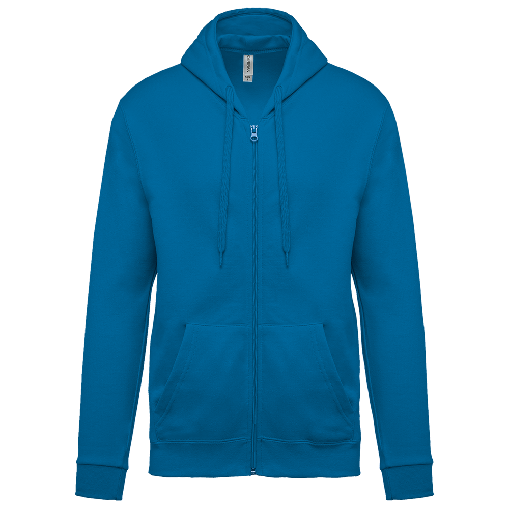80% katoen / 20% polyester. Gekamd katoen. Geborsteld fleece aan de binnenkant. Ingezette mouwen. Nylon ritssluiting. Gevoerde capuchon met toon op toon aanrijgkoordjes. Kangoeroezakken. Ribboord aan mouwuiteinden en aan de onderkant.