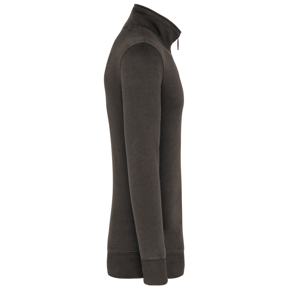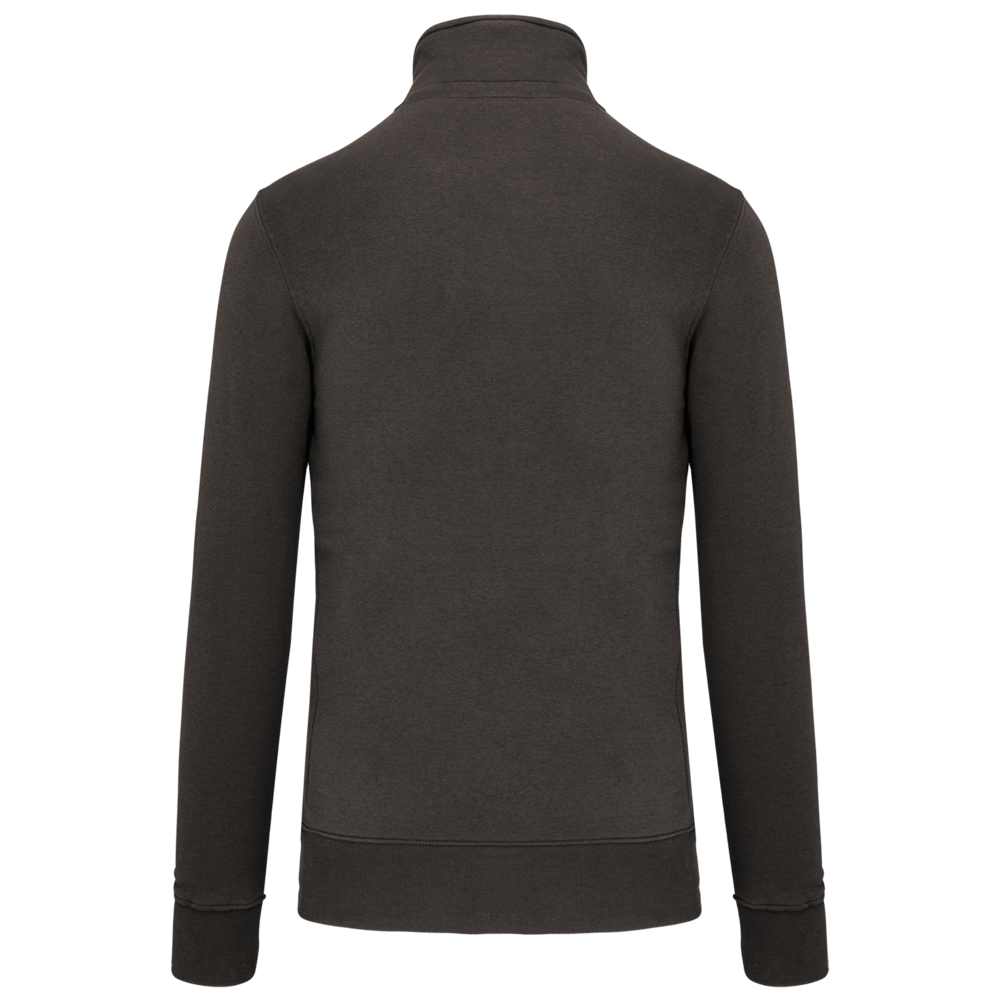 80% katoen / 20% polyester (Ash Heather : 79% katoen / 20% polyester / 1% viscose). Buitenoppervlak 100% katoen. LSF-behandeling (Low Shrinkage Fleece : voorgekrompen fleece). Aan de binnenkant geborsteld fleece 3 draden van gekamd katoen. Ingezette mouwen. Kraag met toon-op-toon plastic ritssluiting. Nektape in contrasterende kleur aan de halsopening (Navy voor de kleur Oxford Grey en Ash Heather ; Oxford Grey voor alle andere kleuren). Ribboord aan mouwuiteinden en aan de onderkant.