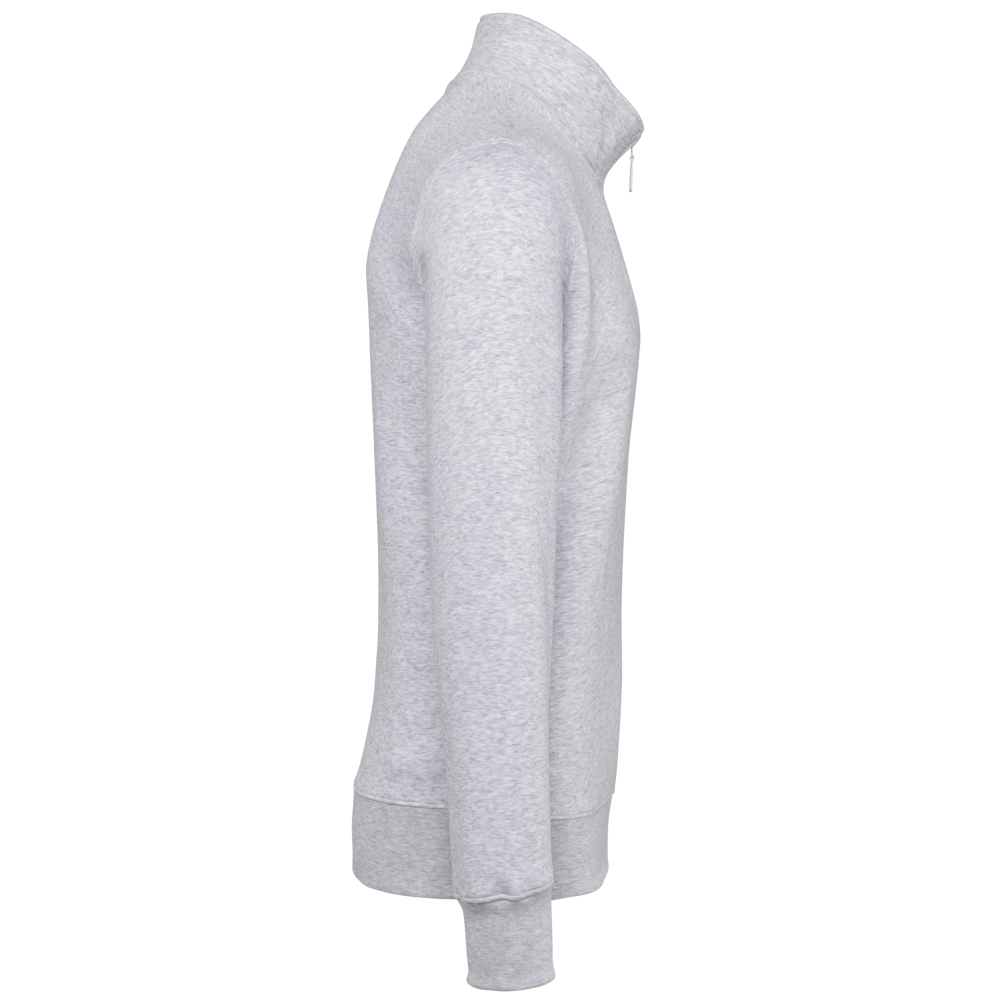 80% katoen / 20% polyester (Ash Heather : 79% katoen / 20% polyester / 1% viscose). Buitenoppervlak 100% katoen. LSF-behandeling (Low Shrinkage Fleece : voorgekrompen fleece). Aan de binnenkant geborsteld fleece 3 draden van gekamd katoen. Ingezette mouwen. Kraag met toon-op-toon plastic ritssluiting. Nektape in contrasterende kleur aan de halsopening (Navy voor de kleur Oxford Grey en Ash Heather ; Oxford Grey voor alle andere kleuren). Ribboord aan mouwuiteinden en aan de onderkant.