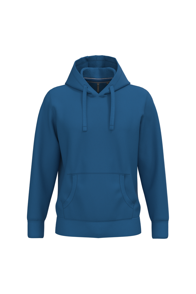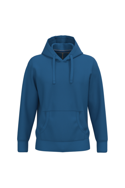 80% katoen / 20% polyester (Ash Heather: 79% katoen / 20% polyester / 1% viscose). Buitenoppervlak 100% katoen. LSF-behandeling (Low Shrinkage Fleece: voorgekrompen fleece). Aan de binnenkant geborsteld fleece 3 draden van gekamd katoen. Ingezette mouwen. Nektape in contrasterende kleur aan de halsopening (Navy voor de kleur Oxford Grey en Ash Heather ; Oxford Grey voor alle andere kleuren). Gevoerde capuchon in honinggraatstructuur met aanrijgkoordjes. Kangoeroezakken. Ribboord aan mouwuiteinden en aan de onderkant.