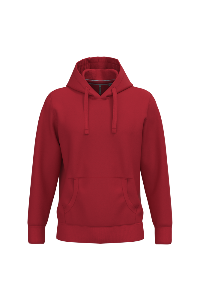 80% katoen / 20% polyester (Ash Heather: 79% katoen / 20% polyester / 1% viscose). Buitenoppervlak 100% katoen. LSF-behandeling (Low Shrinkage Fleece: voorgekrompen fleece). Aan de binnenkant geborsteld fleece 3 draden van gekamd katoen. Ingezette mouwen. Nektape in contrasterende kleur aan de halsopening (Navy voor de kleur Oxford Grey en Ash Heather ; Oxford Grey voor alle andere kleuren). Gevoerde capuchon in honinggraatstructuur met aanrijgkoordjes. Kangoeroezakken. Ribboord aan mouwuiteinden en aan de onderkant.