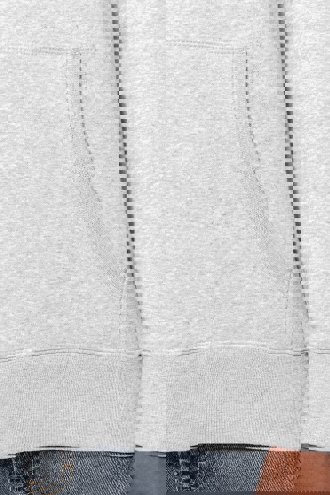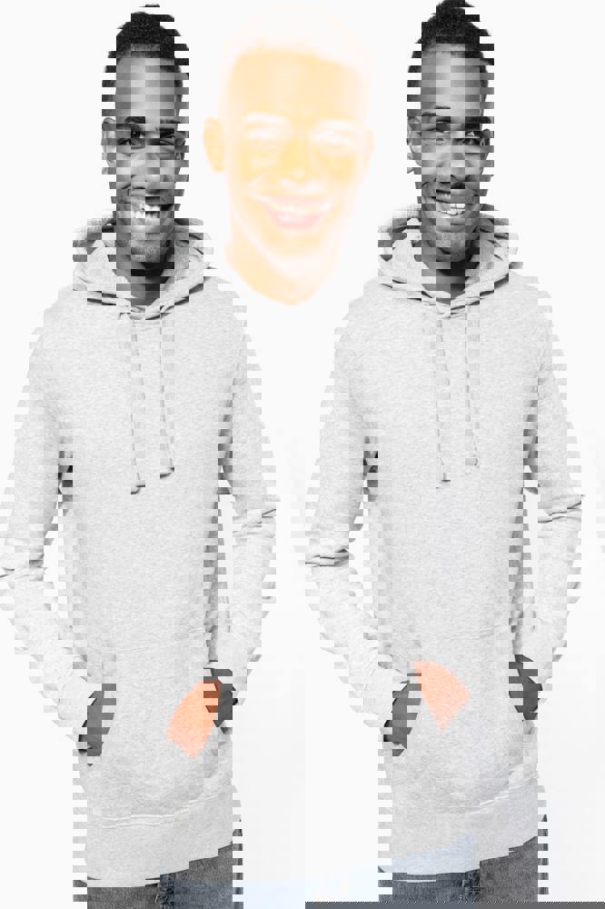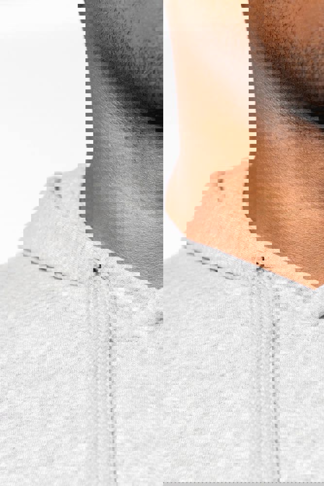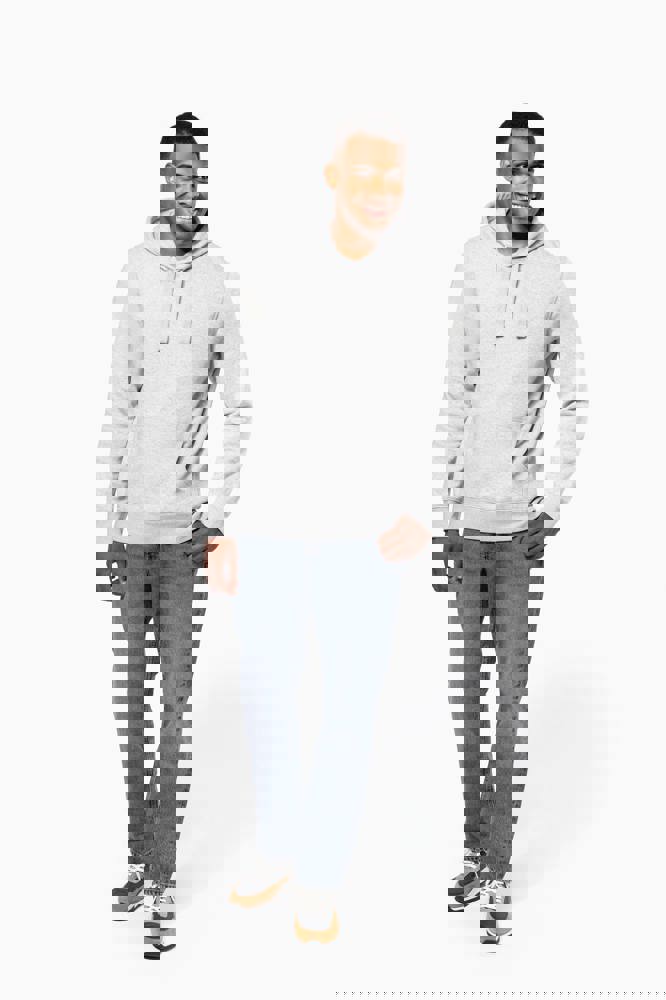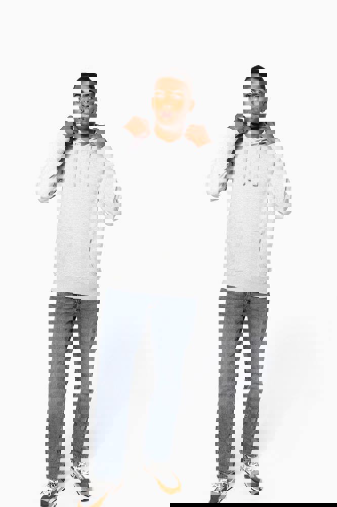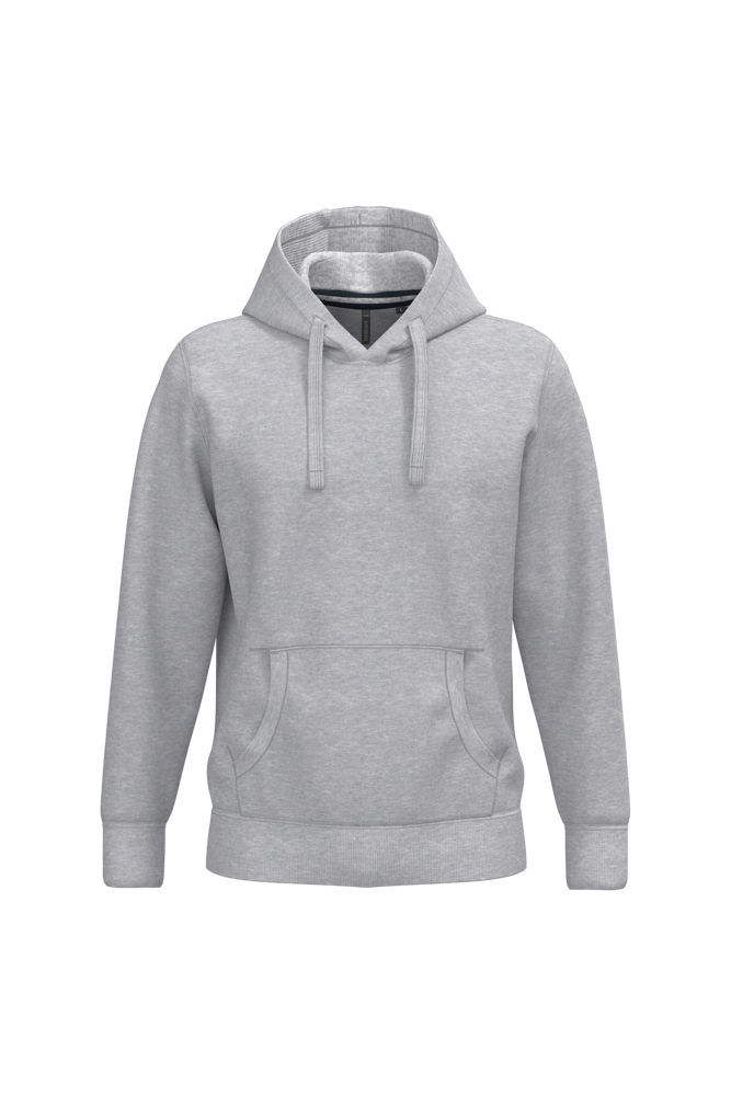 80% katoen / 20% polyester (Ash Heather: 79% katoen / 20% polyester / 1% viscose). Buitenoppervlak 100% katoen. LSF-behandeling (Low Shrinkage Fleece: voorgekrompen fleece). Aan de binnenkant geborsteld fleece 3 draden van gekamd katoen. Ingezette mouwen. Nektape in contrasterende kleur aan de halsopening (Navy voor de kleur Oxford Grey en Ash Heather ; Oxford Grey voor alle andere kleuren). Gevoerde capuchon in honinggraatstructuur met aanrijgkoordjes. Kangoeroezakken. Ribboord aan mouwuiteinden en aan de onderkant.