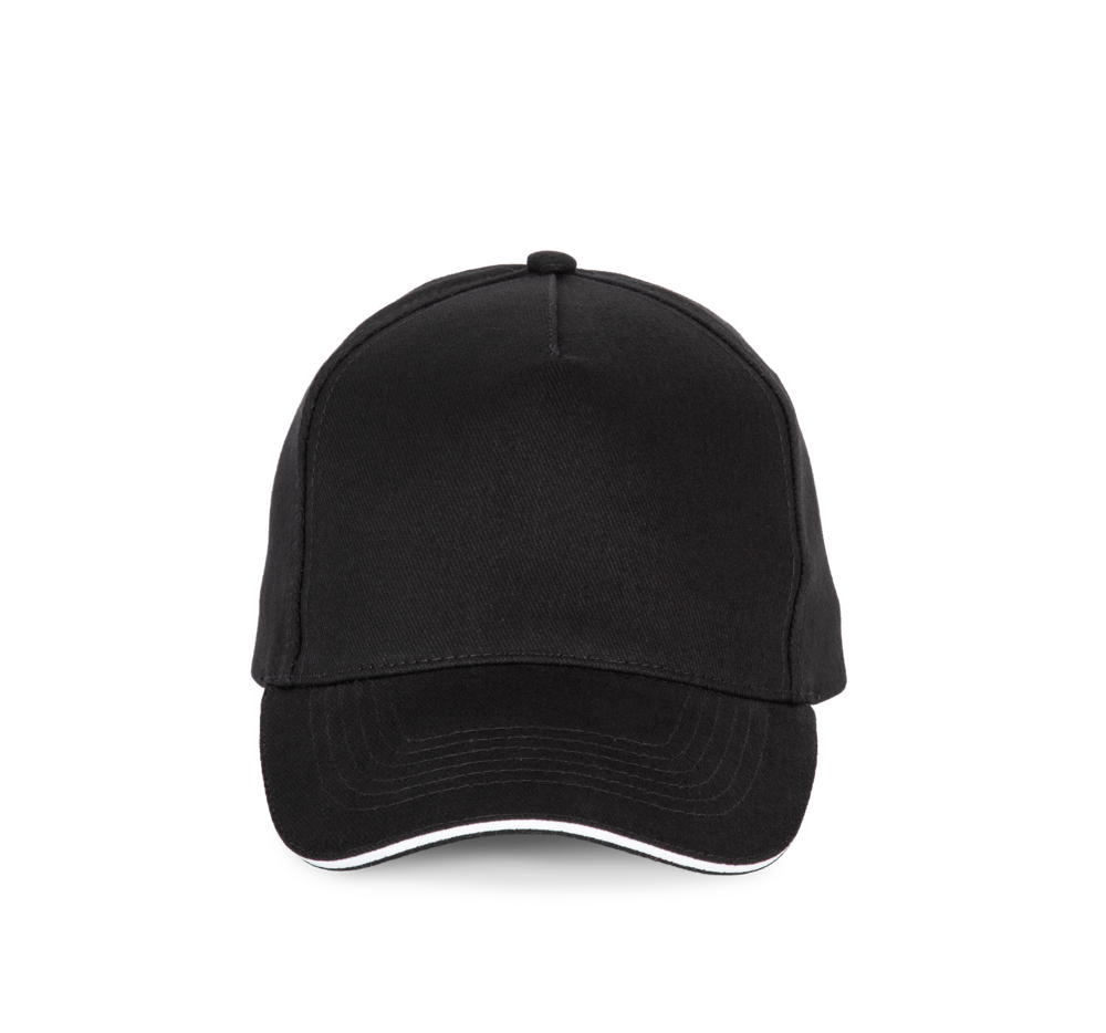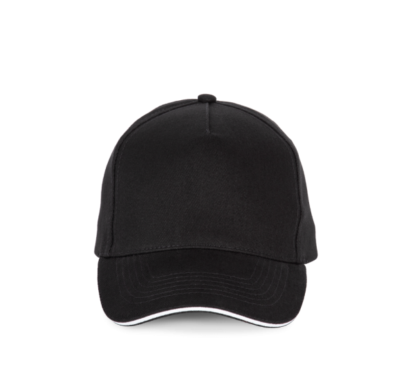 100% katoen. Pet met 5 panelen. Verstelbare sluiting met metalen gesp en zelfblokkerende lus.