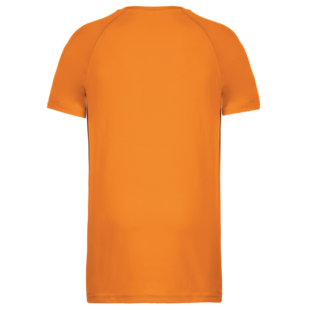 100% polyester. Sneldrogende lichte stof. Ronde hals. Nektape. Raglan mouwen met overstiksels. Afwerking met dubbele stiksels aan de mouwuiteinden en onderkant.