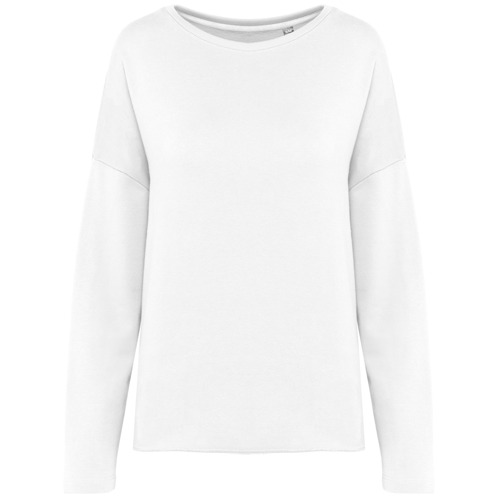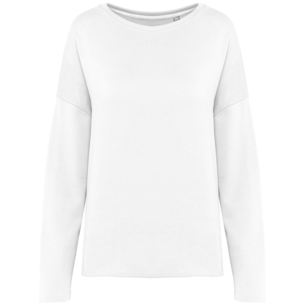 91% katoen / 9% polyester (Light Grey Heather: 87% katoen / 9% polyester / 4% viscose). Fleece “French Terry”. Voelt heel zacht aan. Casual, losse snit met brede halsopening. Nektape met visgraatmotief. Onafgewerkte boorden onderaan. Dubbel stiksel aan de mouwuiteinden.