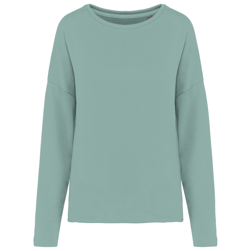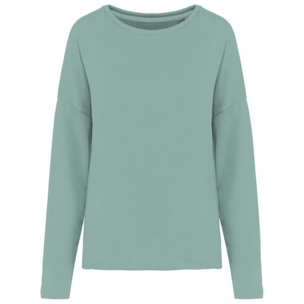 91% katoen / 9% polyester (Light Grey Heather: 87% katoen / 9% polyester / 4% viscose). Fleece “French Terry”. Voelt heel zacht aan. Casual, losse snit met brede halsopening. Nektape met visgraatmotief. Onafgewerkte boorden onderaan. Dubbel stiksel aan de mouwuiteinden.