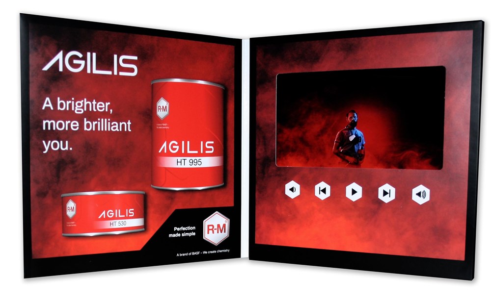 Gevouwen kaart gedrukt in klantontwerp met geïntegreerd IPS-display. Formaat: DIN A5 of 215 x 180 mm, andere formaten op aanvraag. Print: 4/0 gekleurd + matte of glanzende vernis. Inclusief: video-opname, startlogo, maximaal drie bedieningsknoppen. Prestaties: 7 "IPS-scherm (153 x 85 mm) voor haarscherpe beelden vanuit alle hoeken, resolutie: 1024 x 600 px, 2 uur batterijduur, 256 MB opslagcapaciteit, geïntegreerde luidspreker, optioneel met punch-out, videogegevens optioneel uitwisselbaar of wachtwoord beveiligd.