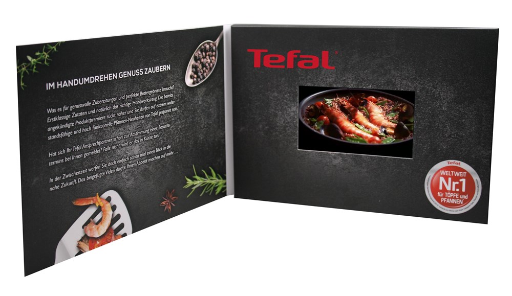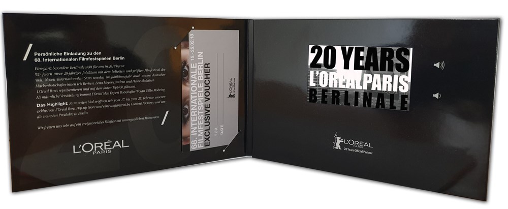 Gevouwen kaart gedrukt in klantontwerp met geïntegreerd HD-scherm. Formaat: DIN A5, DIN A6 of DIN lang, andere formaten op aanvraag. Print: 4/0 gekleurd + matte of glanzende vernis. Inclusief: video-opname, startlogo, maximaal drie bedieningsknoppen. Prestaties: 4-inch HD-scherm (88 x 53 mm), resolutie: 854 x 480 px, 2 uur batterijduur, 256 MB opslagcapaciteit, geïntegreerde luidspreker, met punch-out op aanvraag, videogegevens optioneel uitwisselbaar of beveiligd met een wachtwoord.