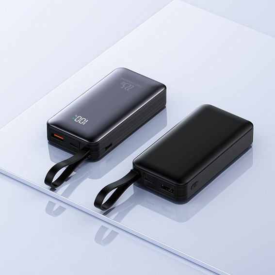 Handige powerbank met 10.000 mAh, geïntegreerde USB-C/Lightning oplaadkabel en digitale...meer